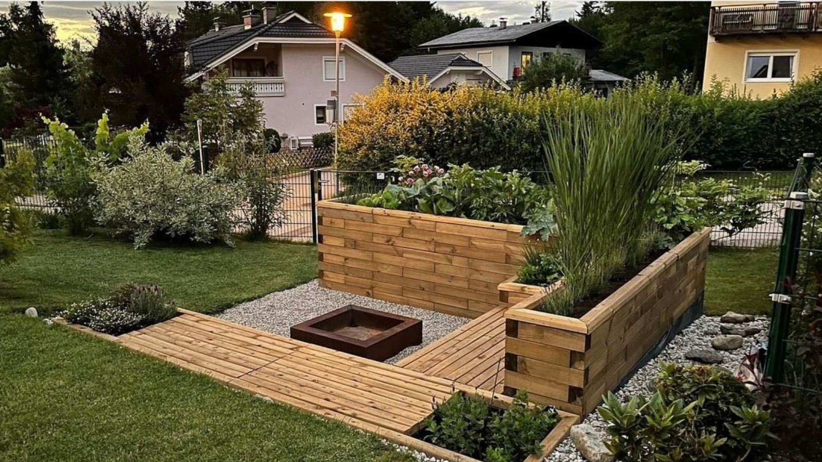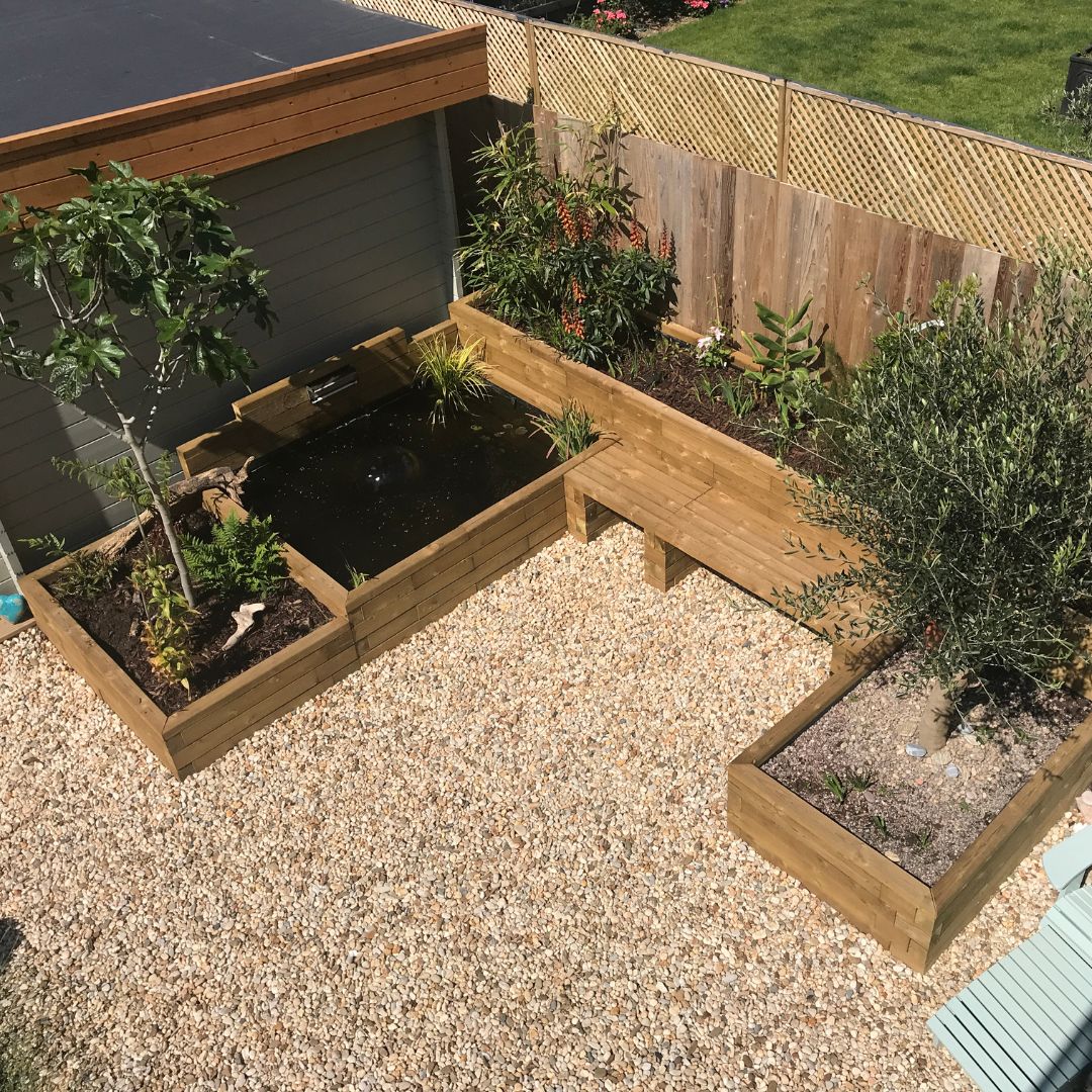 Dit ontwerp bestaat uit grote plantenbakken, een vijver en zitplaatsen, waardoor veel elementen samenkomen om een minituin te creëren. Perfect als je weinig ruimte hebt of als je een plek in de tuin hebt die een facelift kan gebruiken.