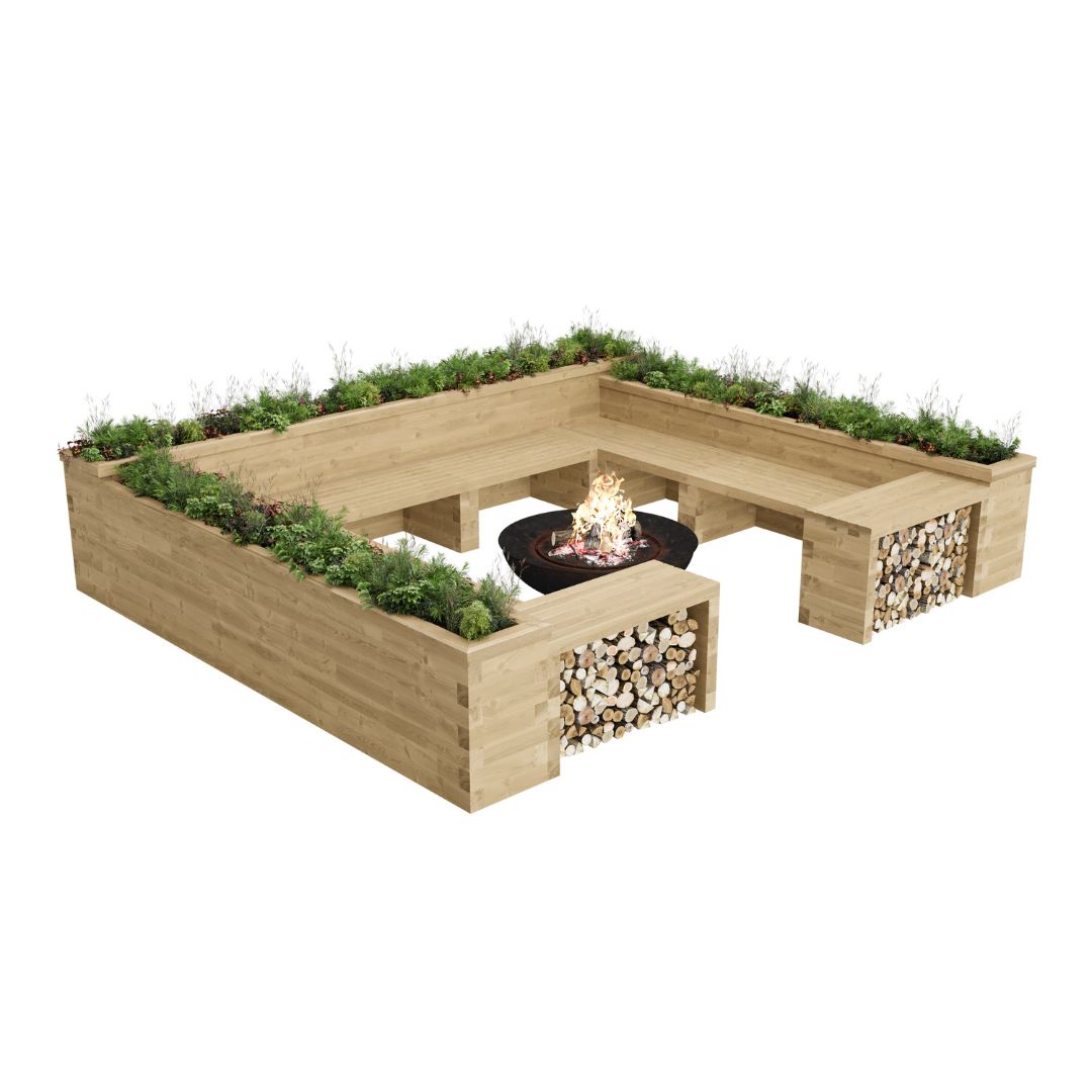 Dit compacte ontwerp omvat twee bakken voor beplanting, veel zitplaatsen en ruimte onder de banken om houtblokken op te bergen. Het neemt ook relatief weinig ruimte in de tuin in beslag. Deze vuurkorfbank is gemaakt met behulp van onze gratis ontwerpservice op basis van de afmetingen die de klant voor de ruimte heeft opgegeven.