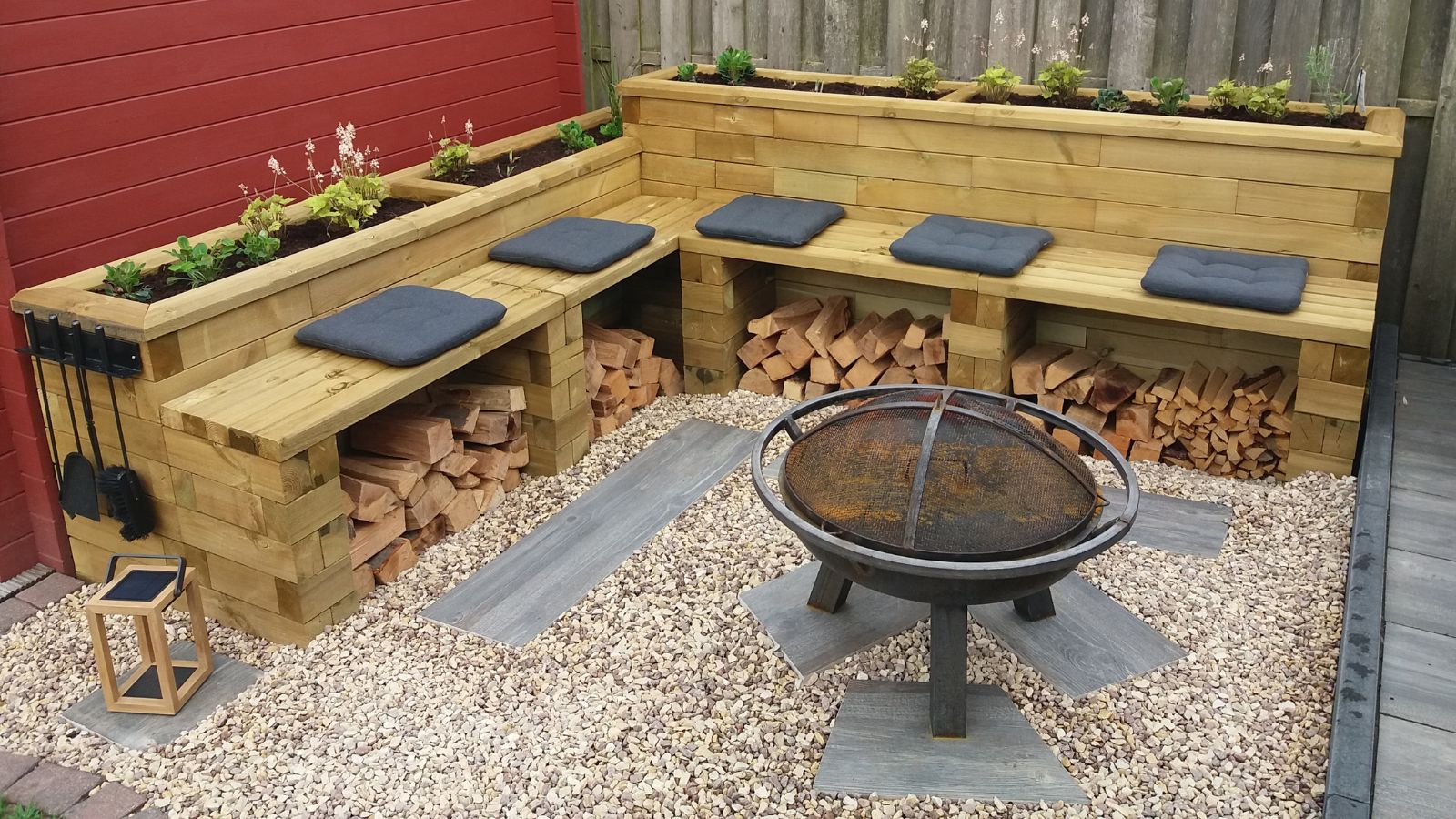 Zitgedeelte rond vuurkorf met opbergruimte voor houtblokken