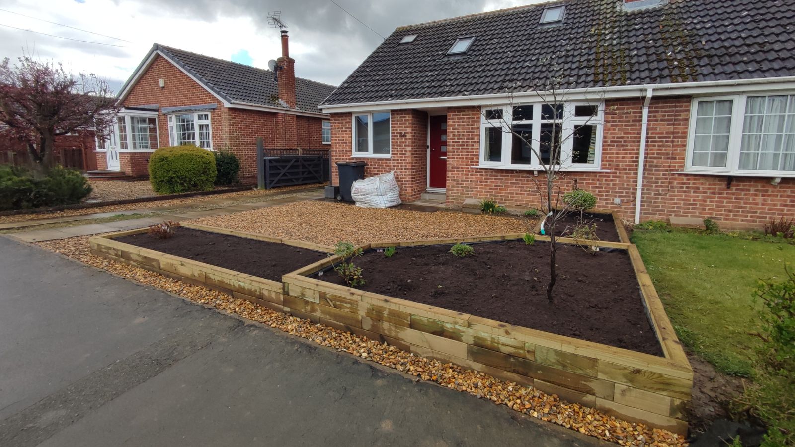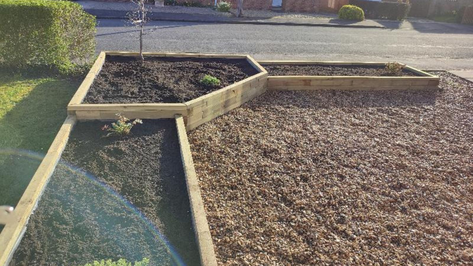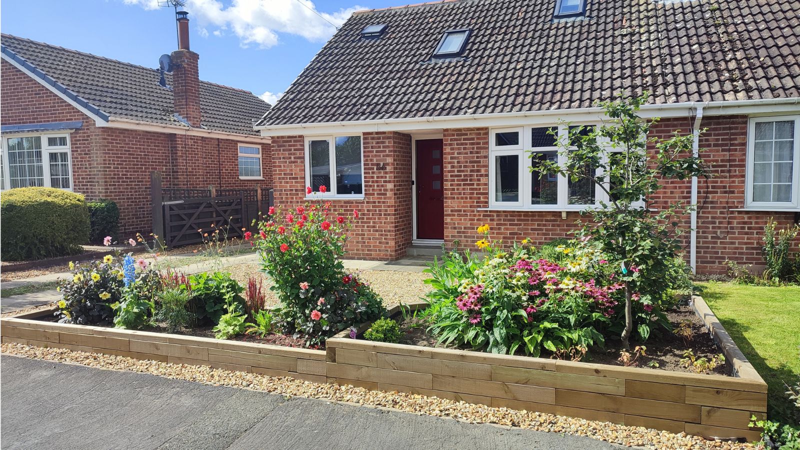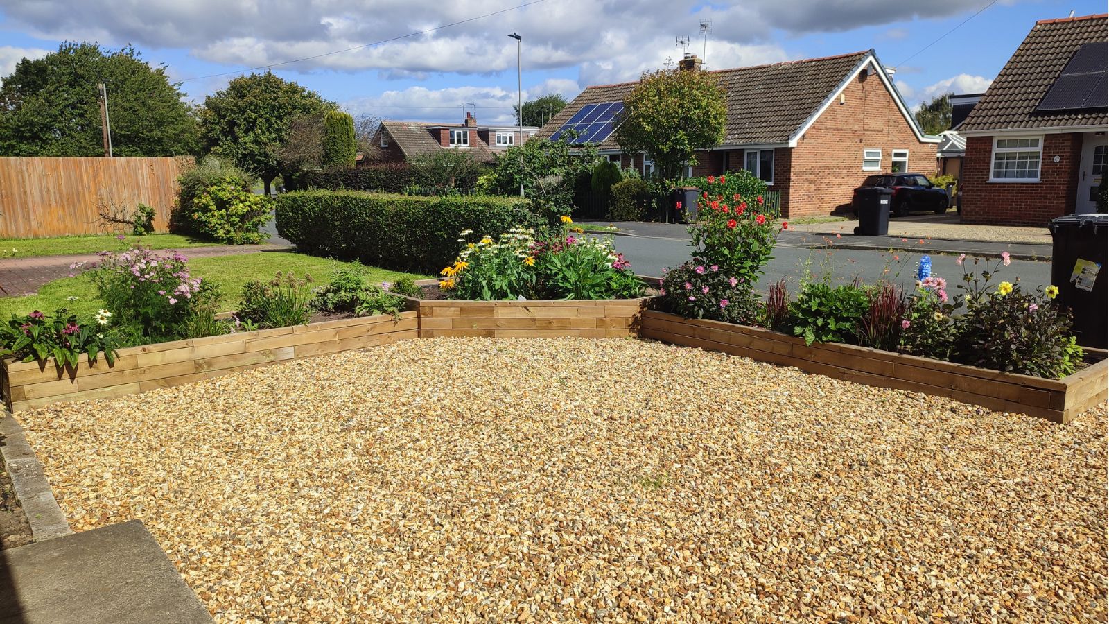 Andrea’s op maat gemaakte verhoogde border van WoodBlocX is een echt pronkstuk in de voortuin geworden: een heel aantrekkelijke plaats om de auto te parkeren! Het creëert een afscheiding tussen de stoep en de grindoprit en bakent de ruimte op subtiele wijze af. Andrea heeft een mix van kleurrijke planten en struiken in de verhoogde borders gezet. Haar oprit is nu licht, open en volledig getransformeerd!