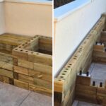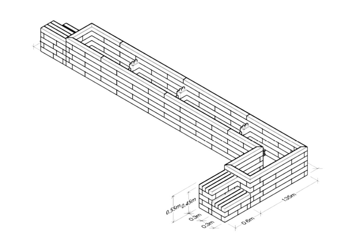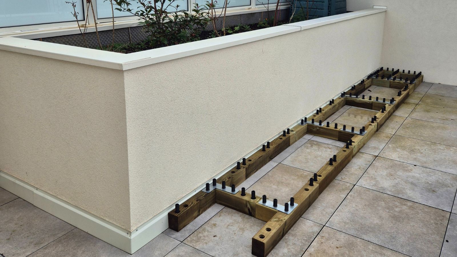 Vanwege de grootte van het L-vormige ontwerp werden interne steunbalken toegevoegd om de stabiliteit van de plantenbak te verbeteren. Bij het bouwen met WoodBlocX op een harde ondergrond zoals tegels, bestrating of beton leveren wij hoekbeugels om de structuur veilig aan de grond te verankeren.