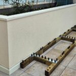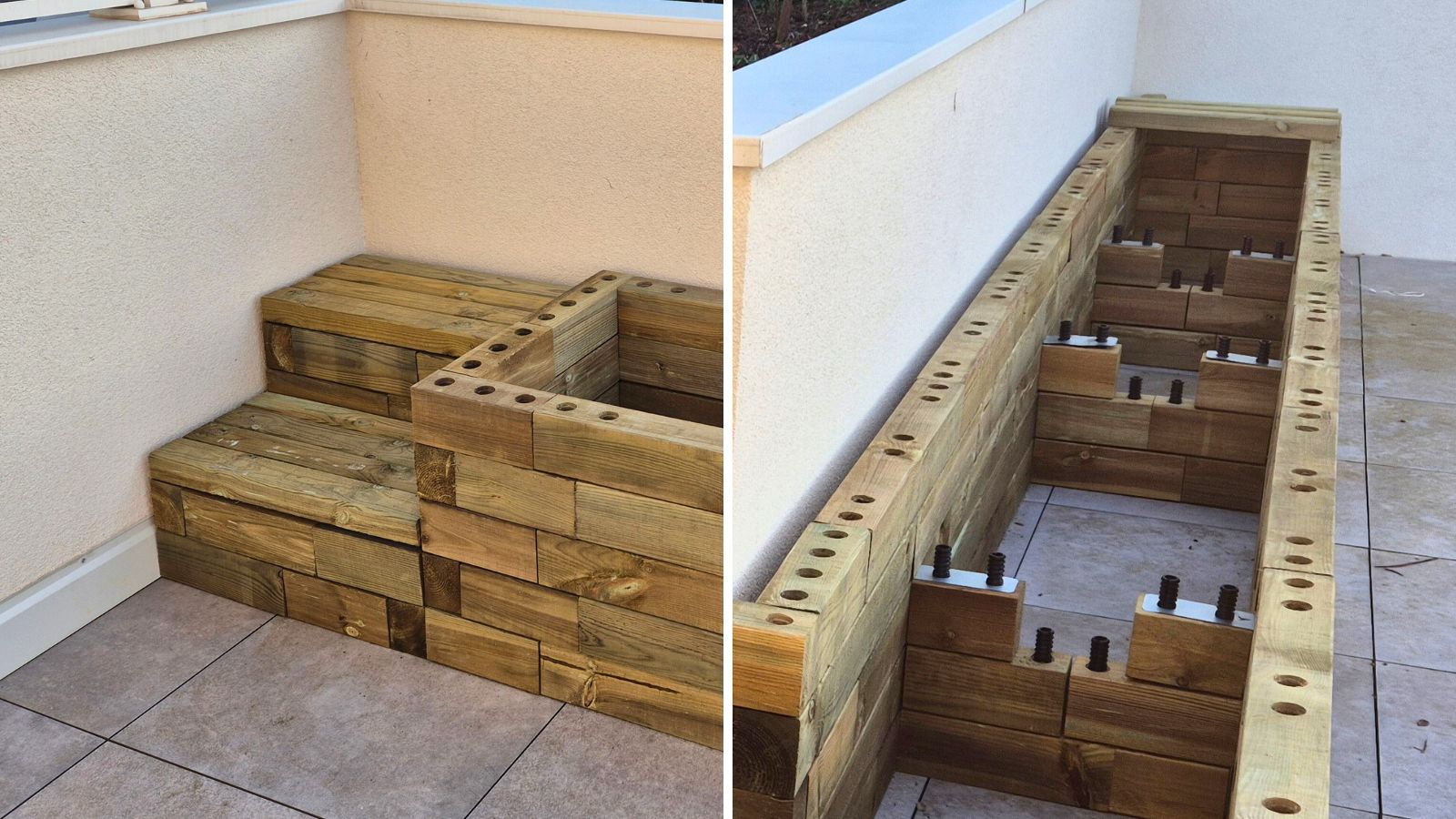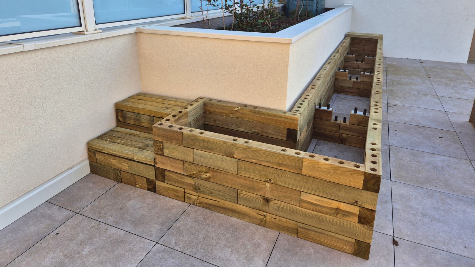Dit WoodBlocX-project draait om een L-vormige verhoogde plantenbak die precies in de hoek van een betegeld dakterras past en tegen een plantenbak met crèmekleurig pleister is gebouwd. De structuur is netjes opgebouwd met ons modulaire systeem en heeft een strakke, uniforme afwerking.