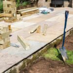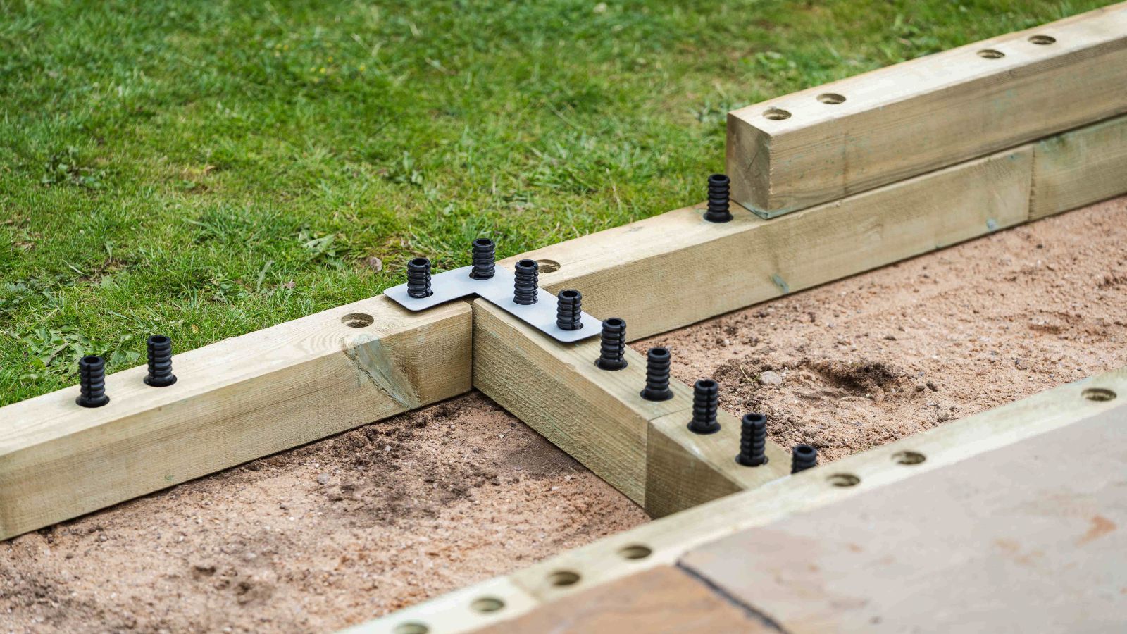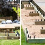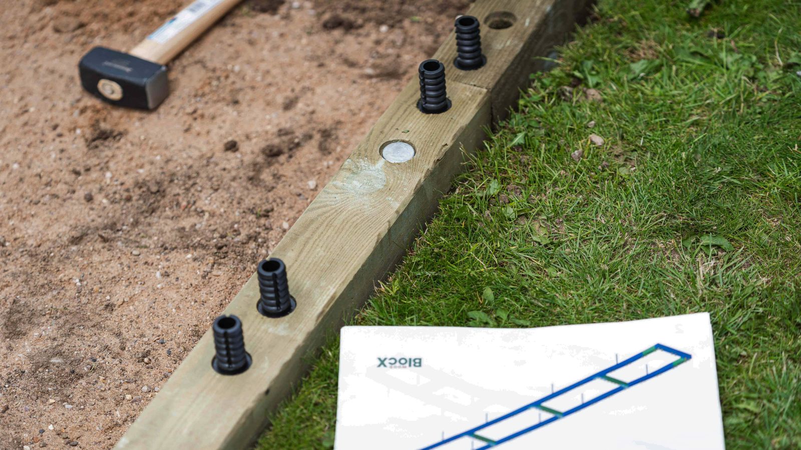 Nadat de tijd was genomen om een voldoende egaal oppervlak te creëren, werd de eerste laag pluggen in de WoodBlocX-blokken gehamerd, weg van de geëgaliseerde grond om ongewenste grondbewegingen te voorkomen. Aan de hand van de laag-voor-laag instructies bij de kit werd de eerste rij WoodBlocX op hun plaats gelegd en werden hoekplaten aangebracht.