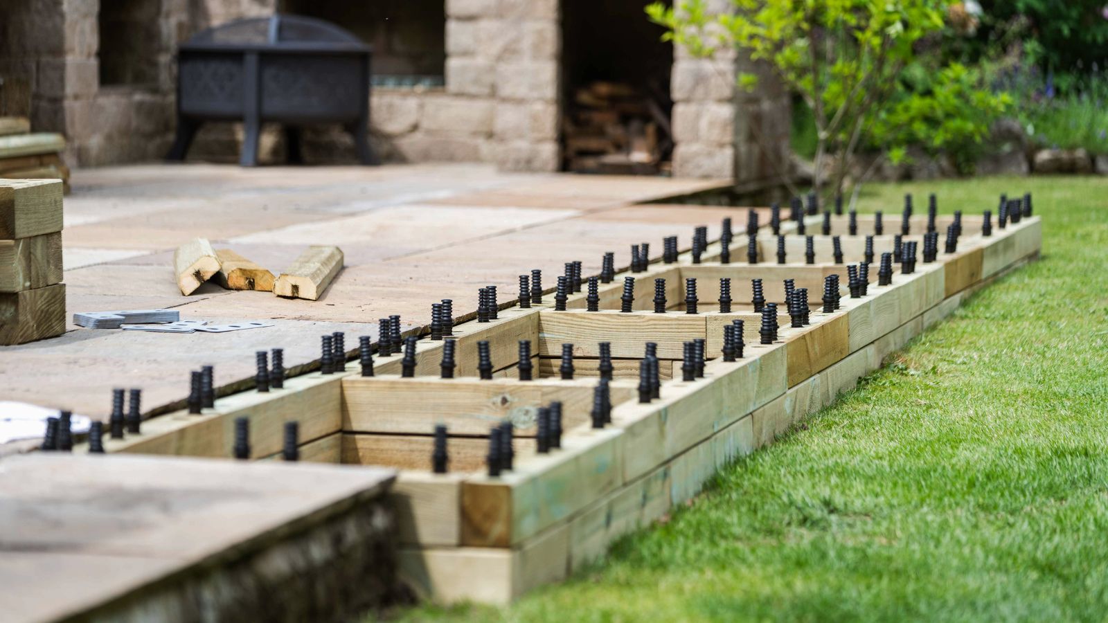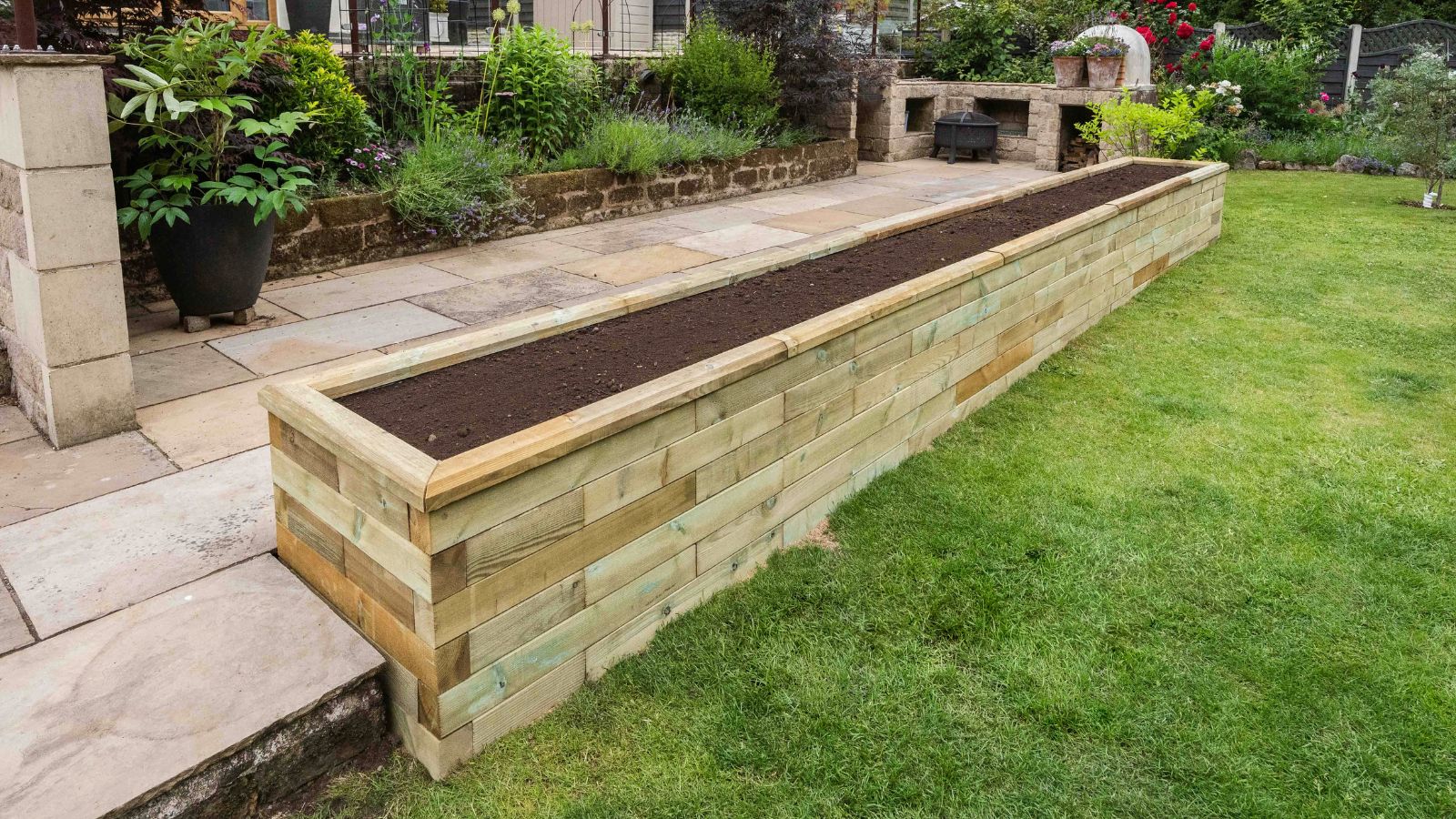 Door de vorm van het terras was dit de ideale plek om een lange, smalle plantenbak op het gras te bouwen pal tegen de terrastegels aan om de ruimte af te bakenen en om als blikvanger te dienen terwijl ze buiten zaten of zich vermaakten op het onderste terras. Jill zou de potten dan kunnen weghalen en meer terrasruimte krijgen terwijl er volop nieuwe ruimte werd gemaakt om allerlei planten in de plantenbak te kweken.