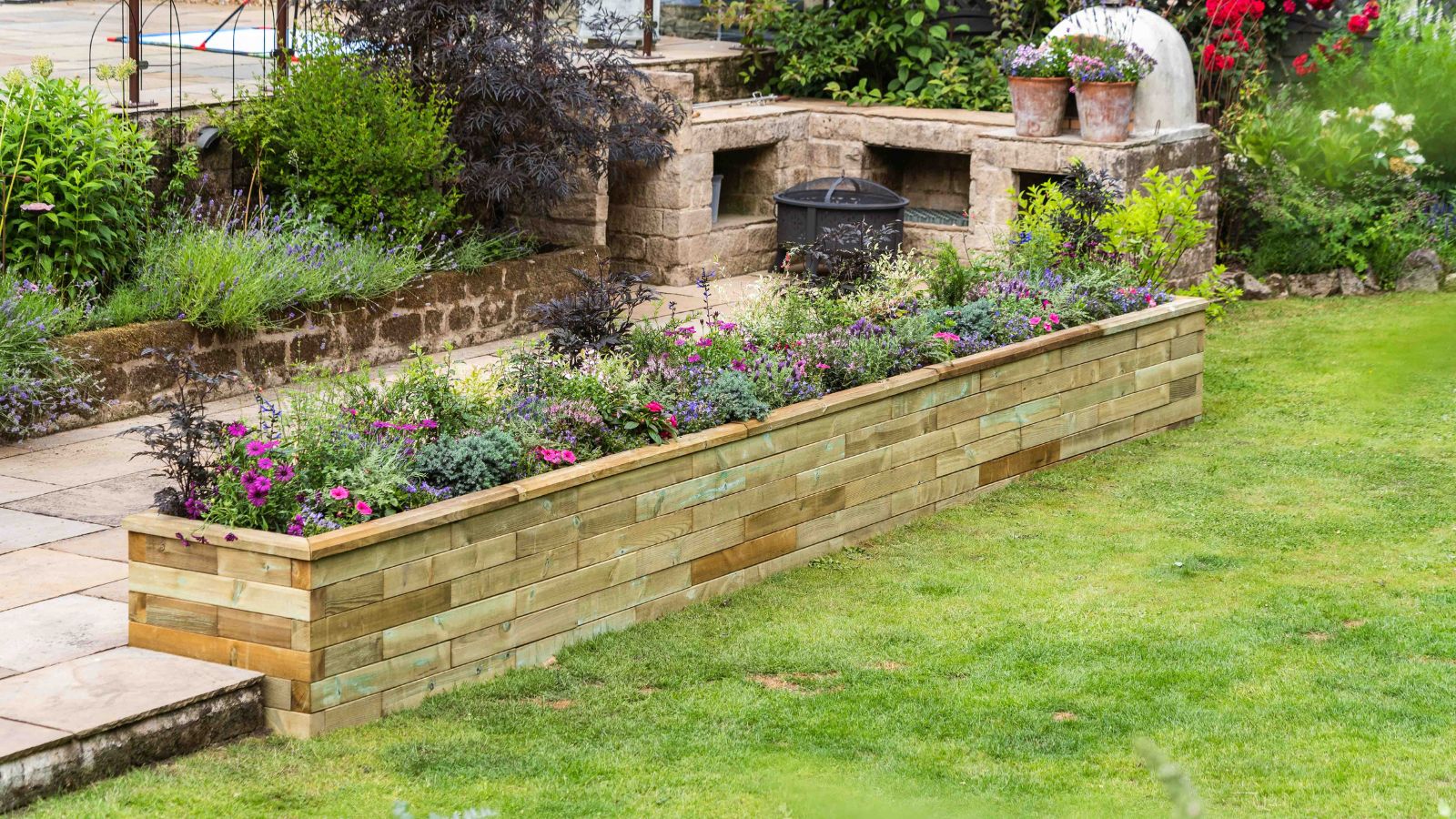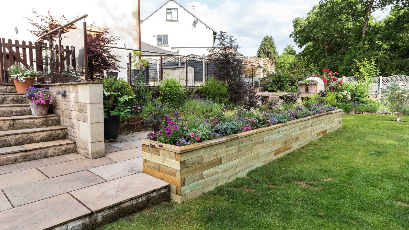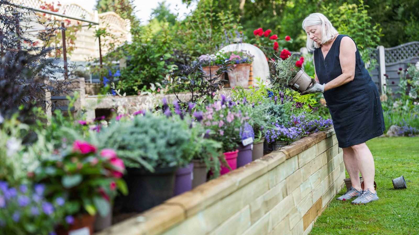 Jill had enkele struiken en planten in potten langs de rand gezet om de overgang van het terras naar het gazon wat vriendelijker te maken, maar deze namen waardevolle terrasruimte in beslag en vereisten meer verzorging tijdens de zomermaanden, omdat de grond op warmere dagen snel uitdroogt.