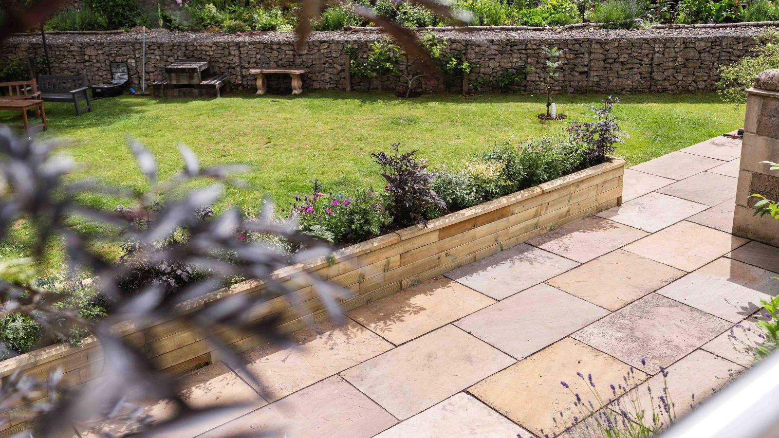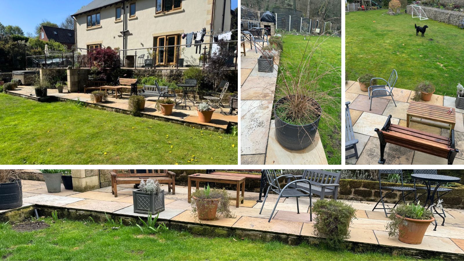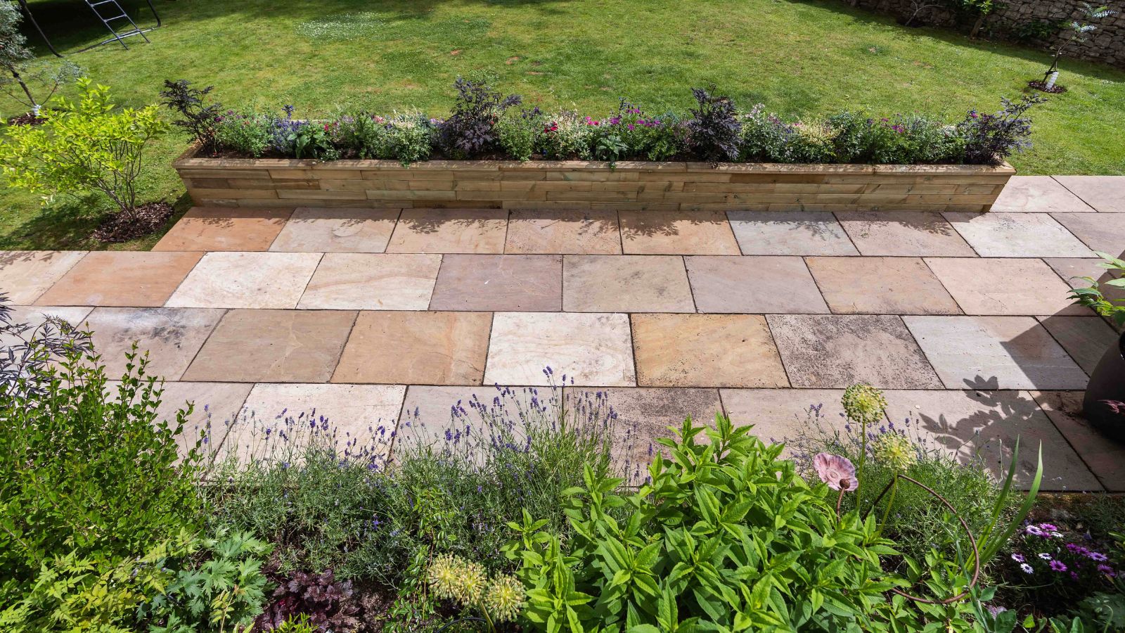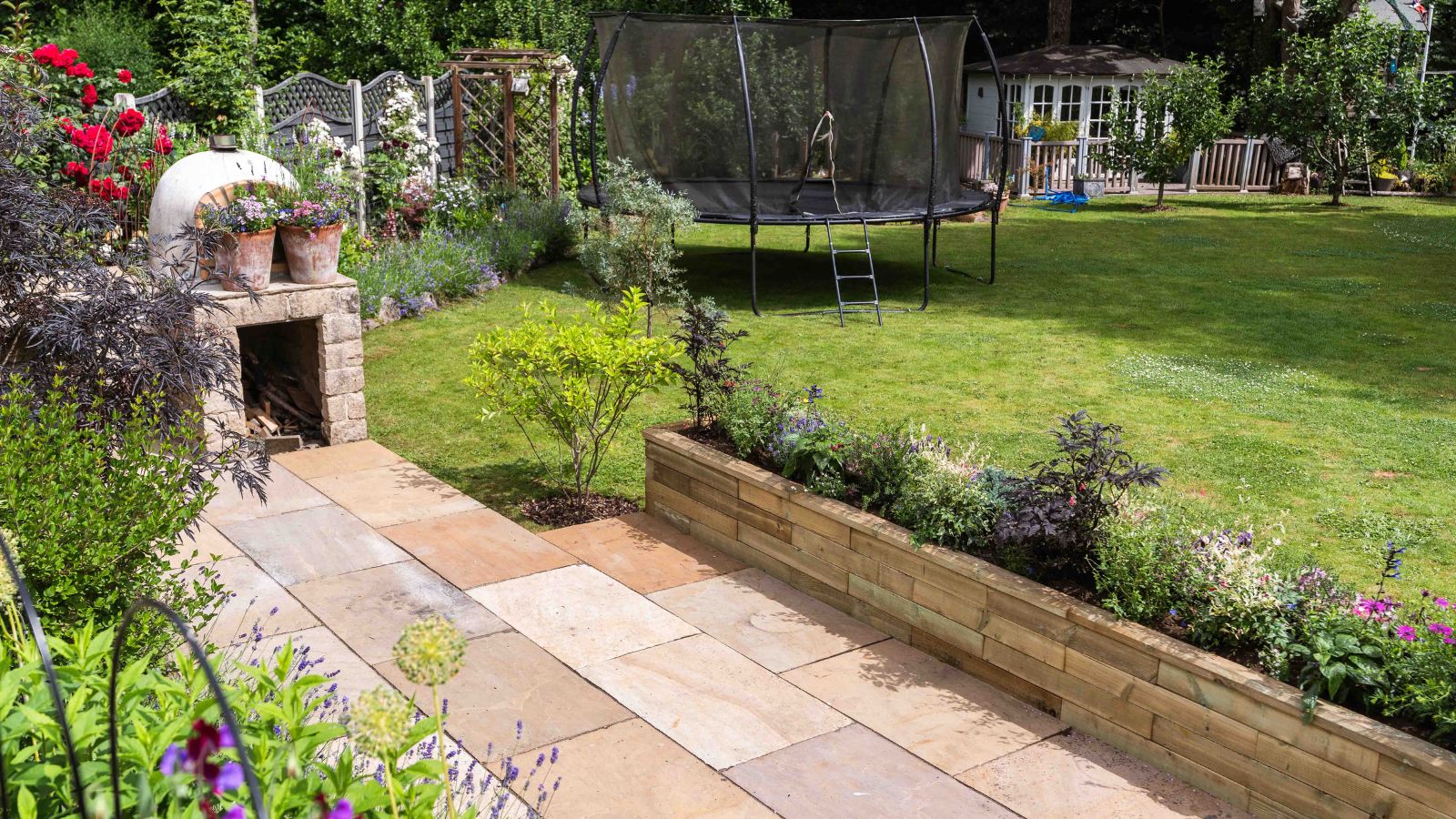 Jill had enkele struiken en planten in potten langs de rand gezet om de overgang van het terras naar het gazon wat vriendelijker te maken, maar deze namen waardevolle terrasruimte in beslag en vereisten meer verzorging tijdens de zomermaanden, omdat de grond op warmere dagen snel uitdroogt.