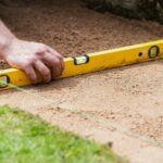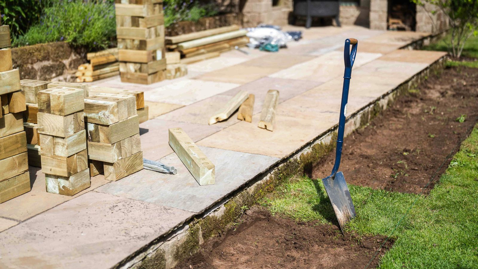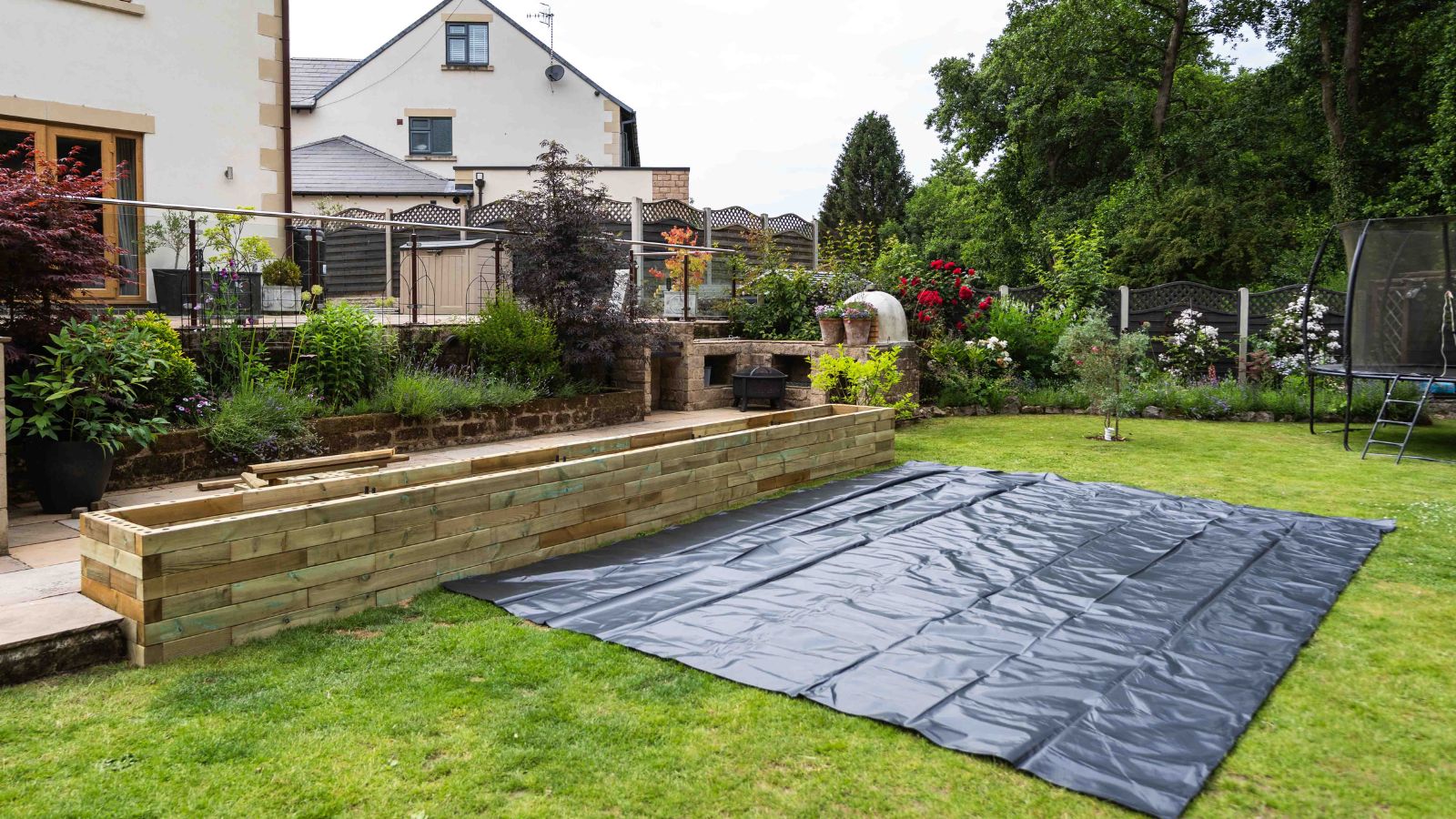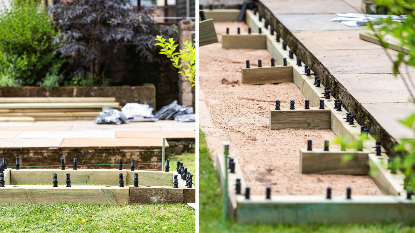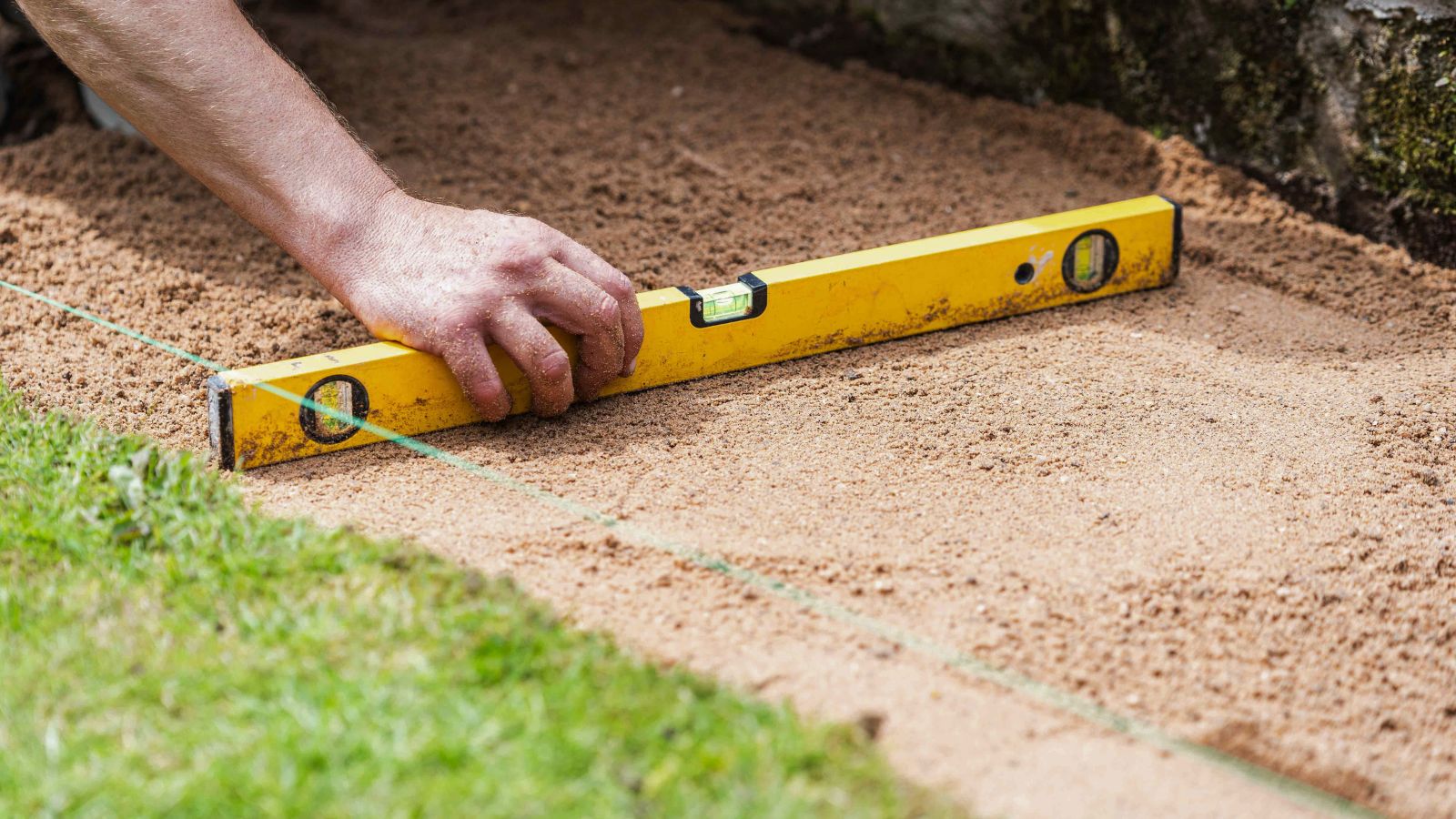 Hoewel het gazon voor het terras op het oog vlak leek, bleek na het meten van de afstand ten opzichte van de terrastegels dat de grond van rechts naar links iets afliep. Om ervoor te zorgen dat de verhoogde bak correct zou worden gebouwd, werd het gras uitgestoken en verwijderd en werd een laag scherp bouwzand gebruikt om de grond te egaliseren.