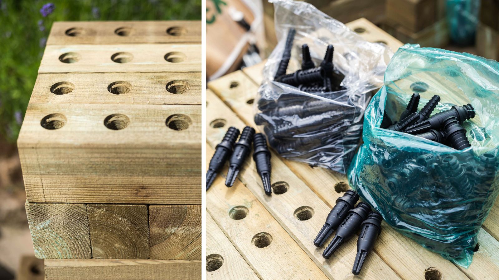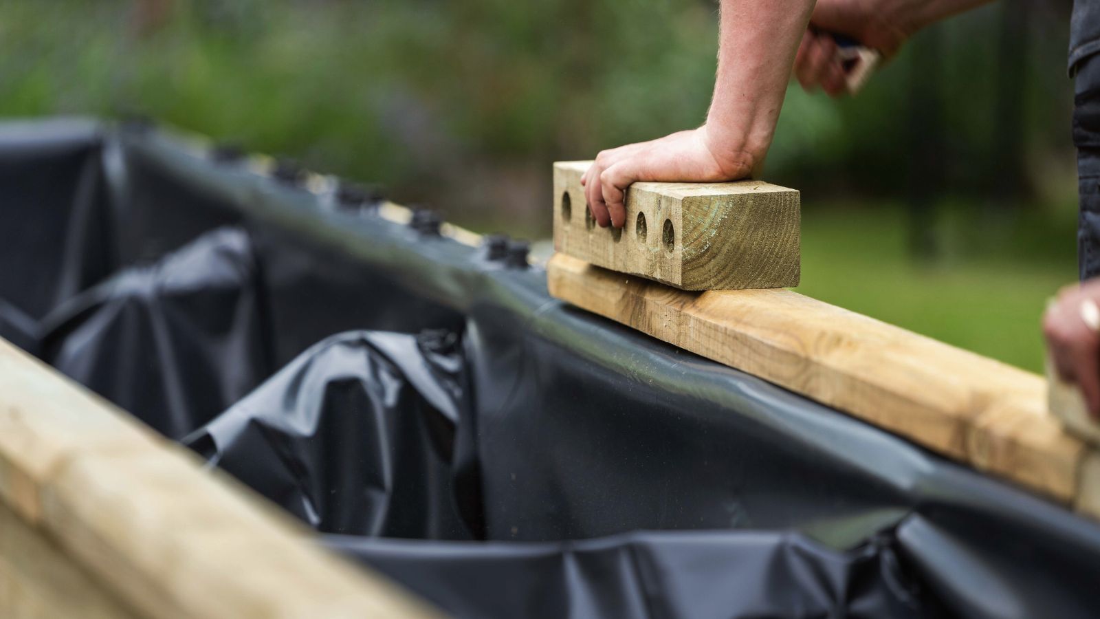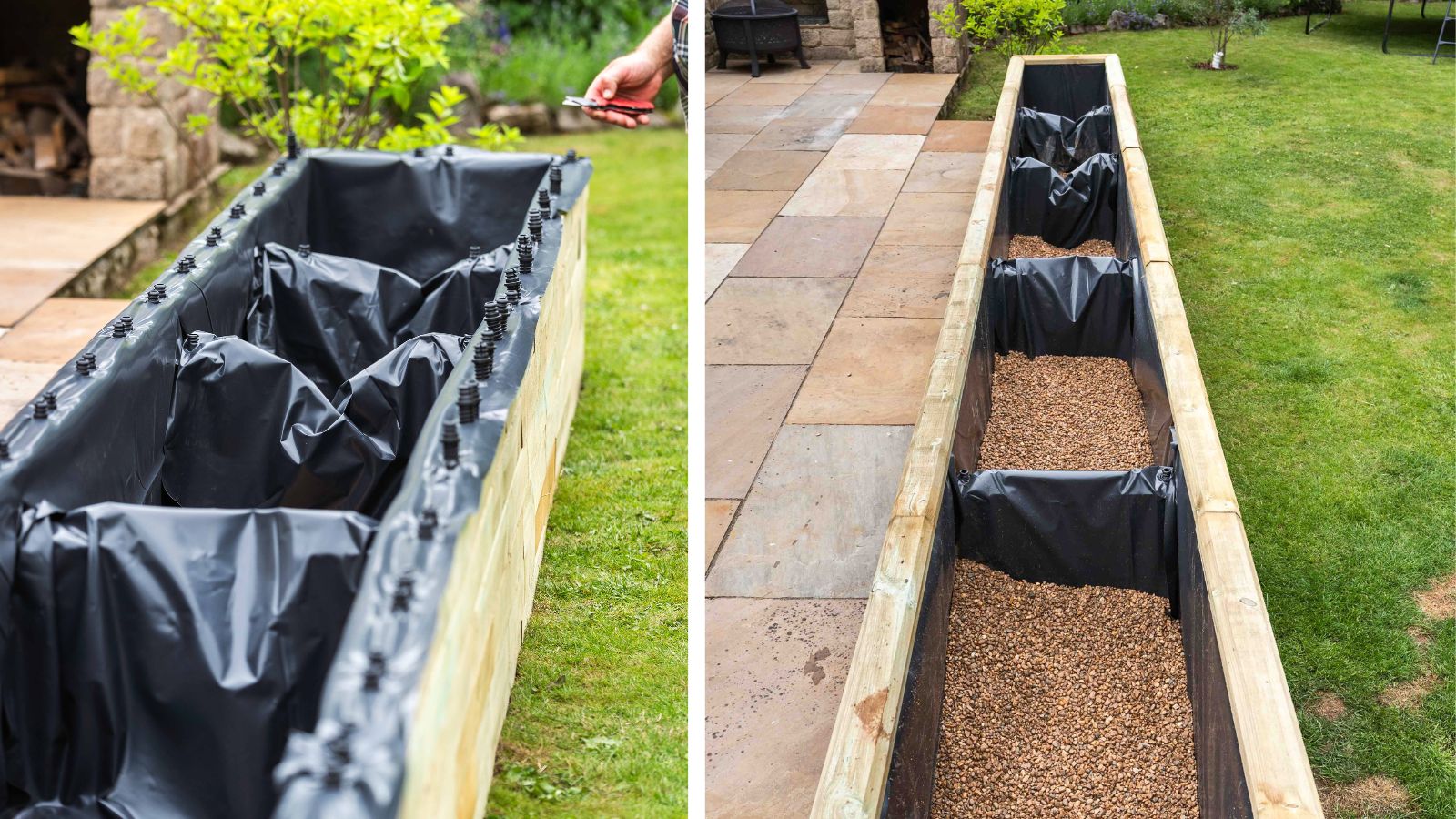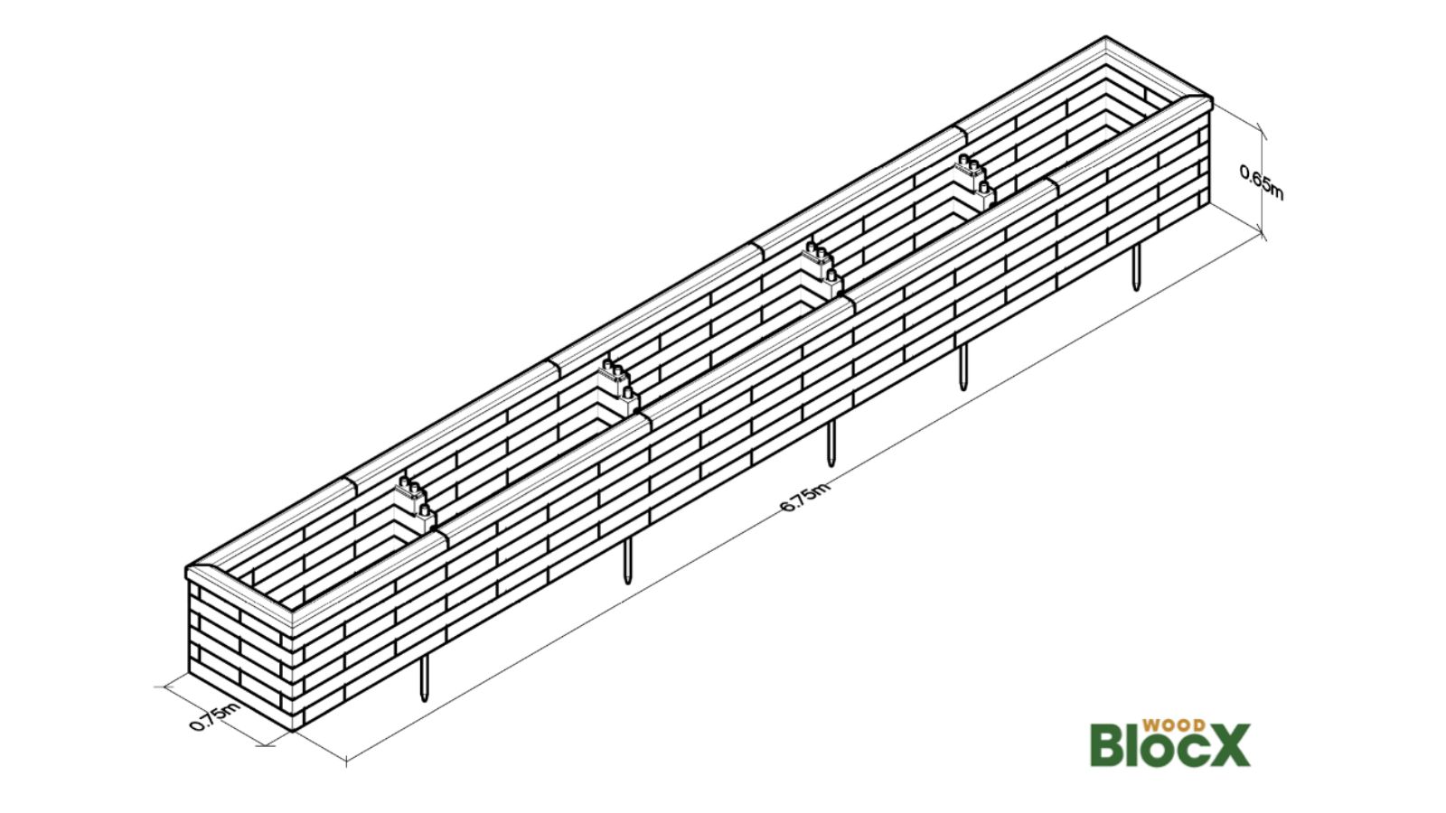 Vanwege de lengte en hoogte van Jill’s plantenbak bevatte het ontwerp interne steunbalken over de volledige breedte van de structuur om beide kanten aan elkaar vast te maken. Eenmaal gevoerd, gevuld met aarde en beplanting, kun je deze steunbalken niet zien, maar ze maken de WoodBlocX-bak supersterk!