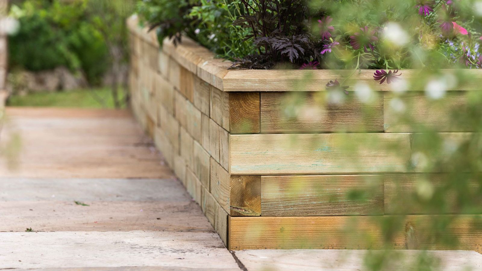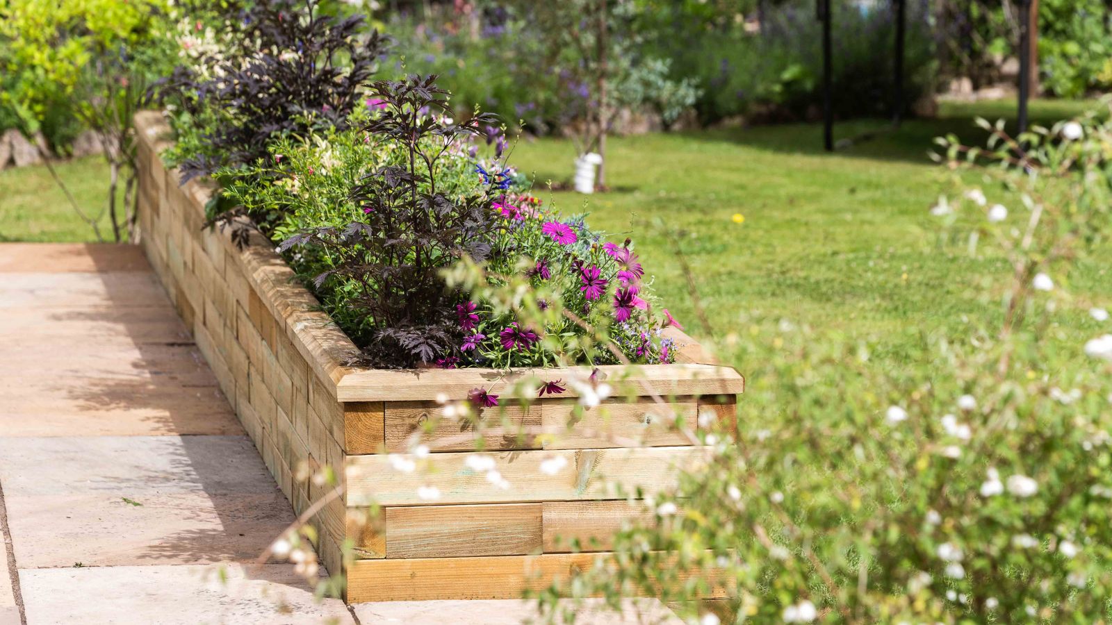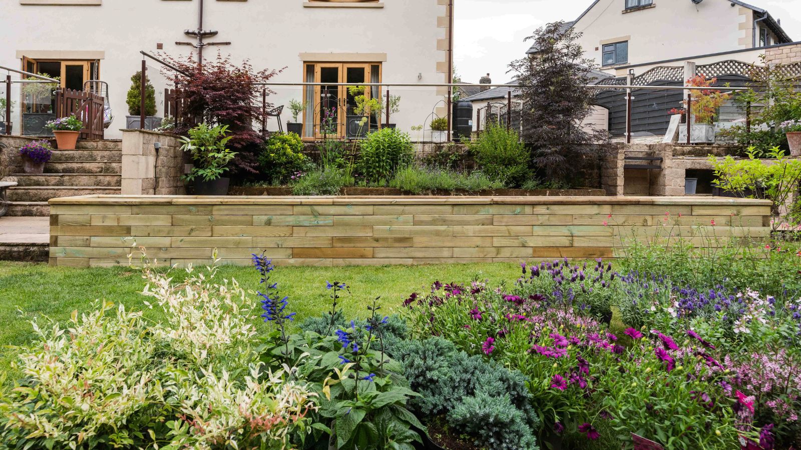 Jill heeft een grote verscheidenheid aan vaste planten en eenjarigen geplant die het hele jaar door aantrekkelijk blijven en het slimme beplantingsschema ziet er vanaf beide kanten van de structuur net zo geweldig uit. Door de positie van de plantenbak tegen het terras wordt dit nu afgeschermd en is het een heerlijke besloten ruimte om te zitten en te ontspannen of te genieten van een barbecue met het gezin.