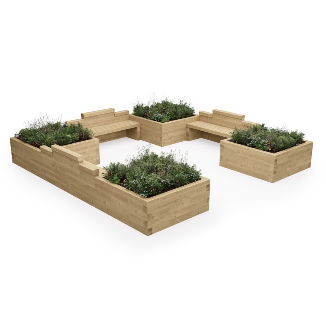 Het U-vormige ontwerp bestaat uit een L-vormige verhoogde bak, met een vierkante plantenbak en een geïntegreerd bankje.