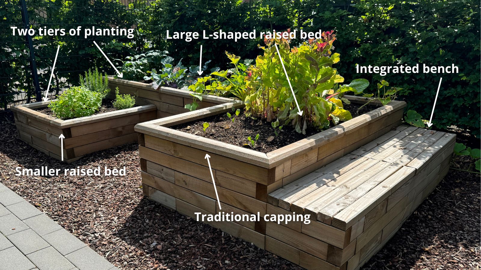 Het voltooide ontwerp is een geweldige aanwinst voor de gemeenschappelijke tuin in het algemeen en biedt volop ruimte om groenten en fruit te kweken op twee verschillende niveaus. Bovendien is er ook nog een plek om te zitten en van dit rustige hoekje van de tuin te genieten!