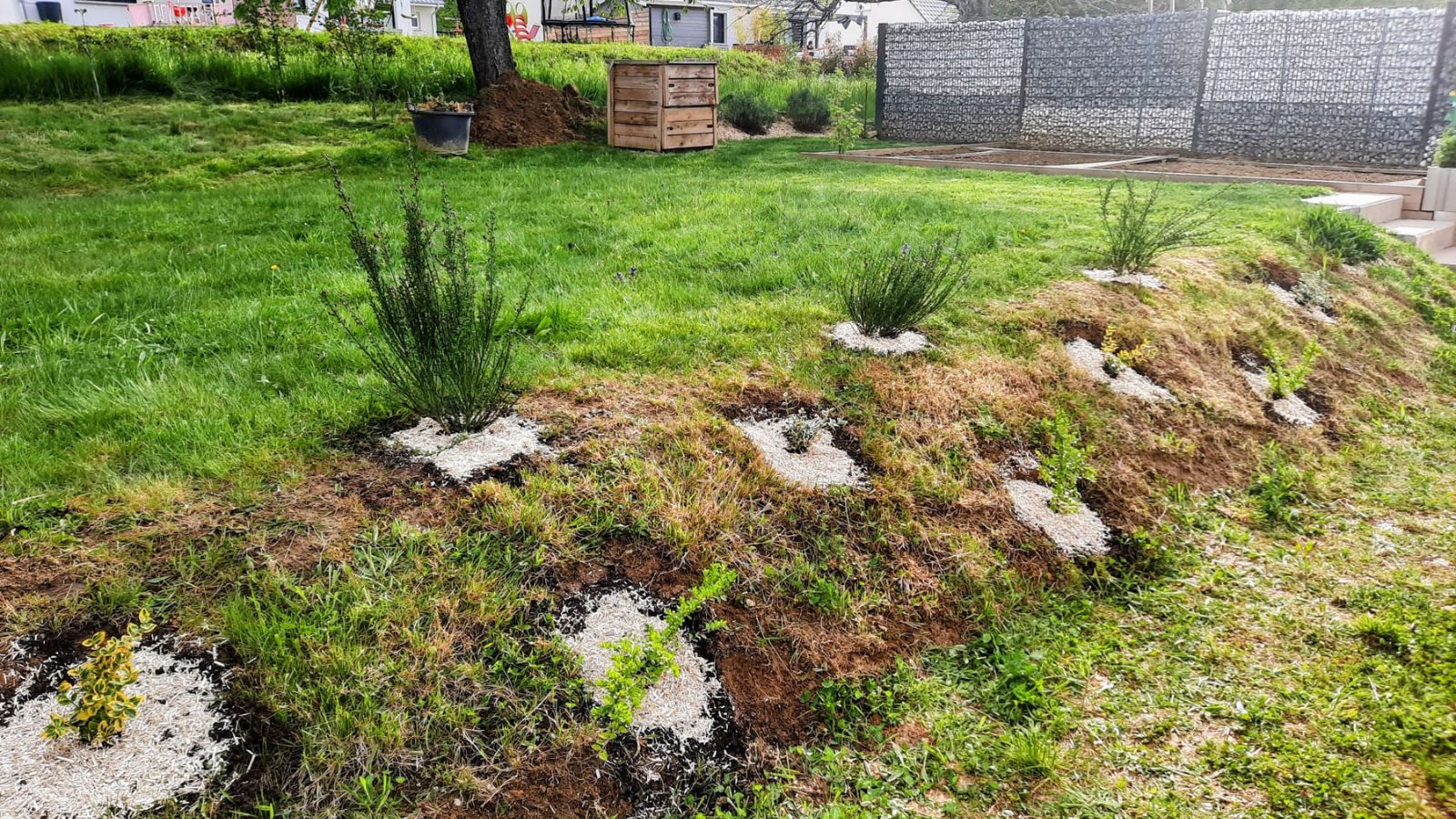 De uiteindelijke keerwand van Thibaut ziet er schitterend uit in de ruimte en is een perfecte verbinding van de twee delen van de tuin. De gekozen locatie van de treden geeft toegang tot het gazon en de hoogte van de wand is ideaal voor beplanting. Thibaut koos ervoor om verschillende heesters te planten en voegde ter afwerking een beschermende laag schors toe. De gekozen planten zorgen voor wat privacy op het terras en zijn zowel vanaf het terras als het grasveld te bewonderen.