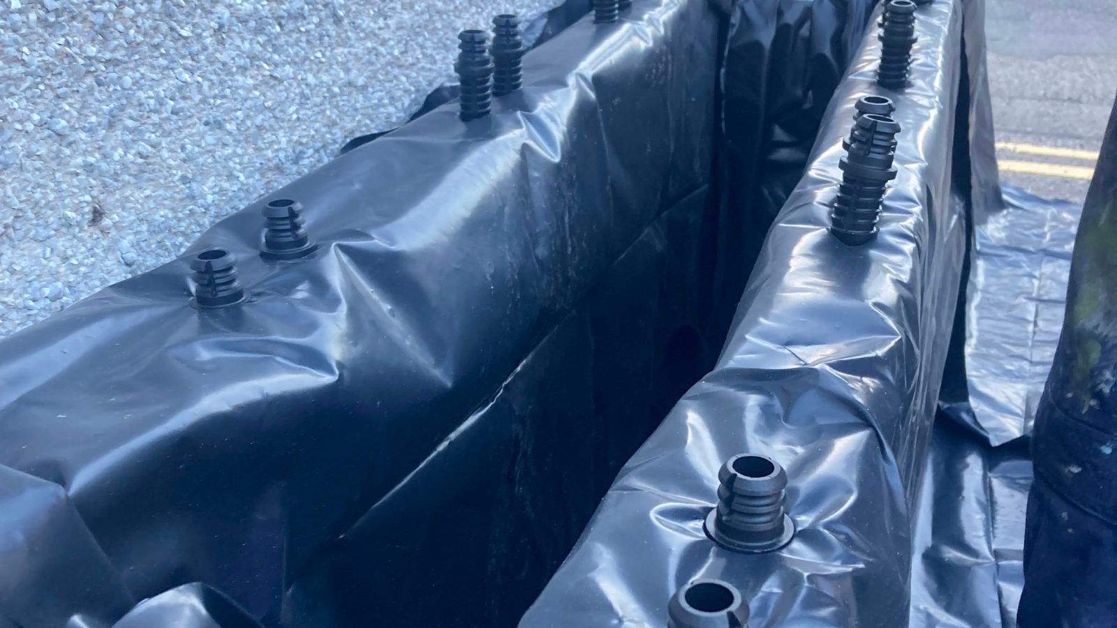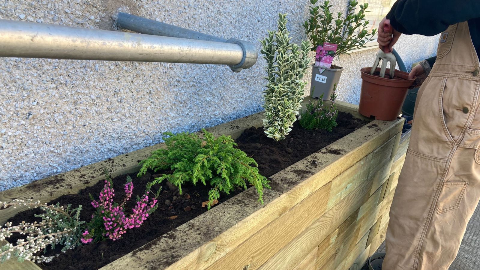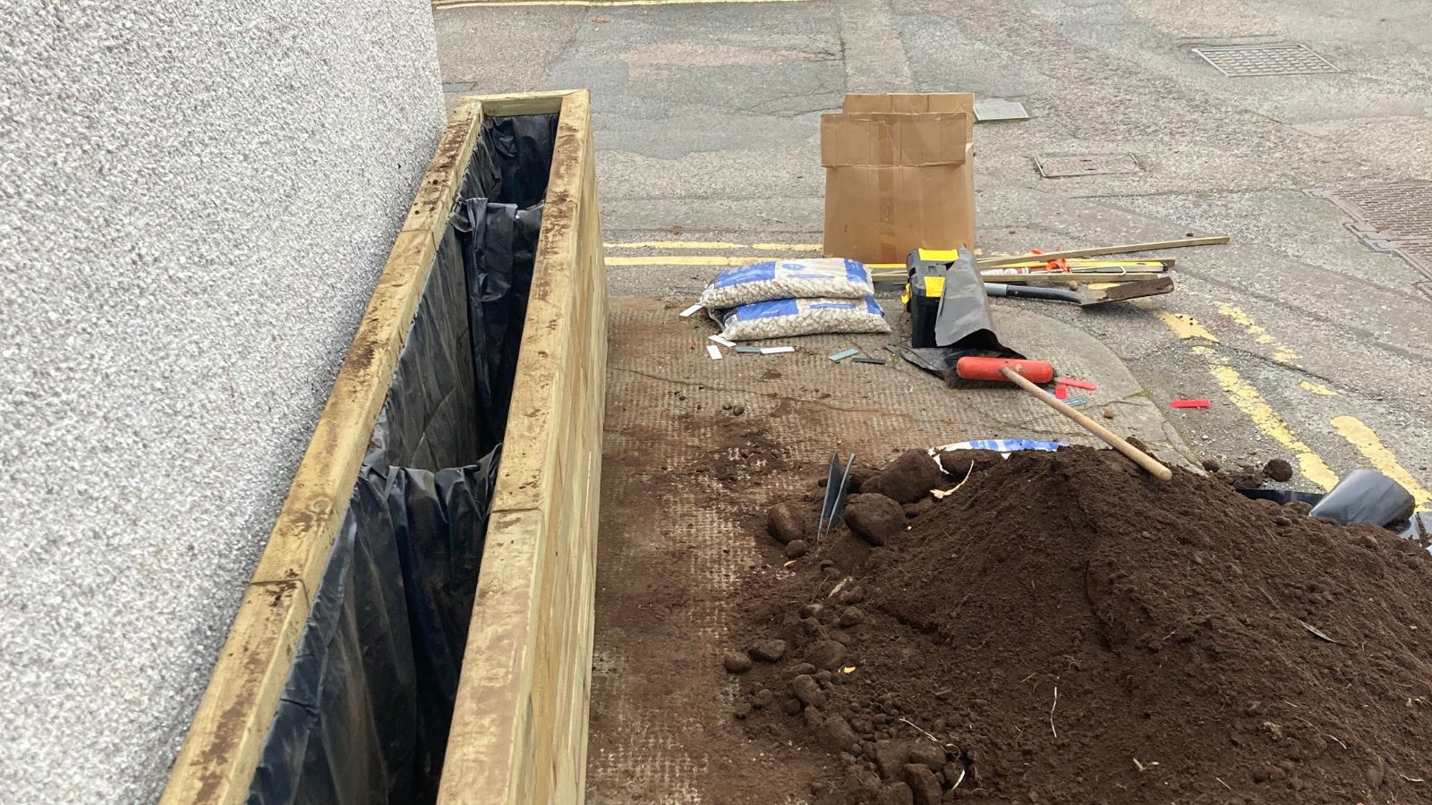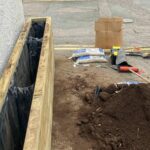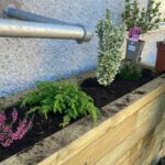 Om de levensduur van de verhoogde WoodBlocX-plantenbak te maximaliseren, werd een voering (die als extra item aan de bestelling was toegevoegd) onder de afdekkingslaag aangebracht om de zijkanten en steunbalken te beschermen. Er werden kleine gaatjes in de onderkant van de voering gemaakt voor drainage van overtollig water en een paar zakken grind gestort om een eenvoudige drainagelaag te maken. Tuinaarde en planten werden door een lokale leverancier aan het Highland Yoga Collective geschonken en kort na het bouwen van de plantenbak voor beplanting gebruikt.