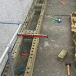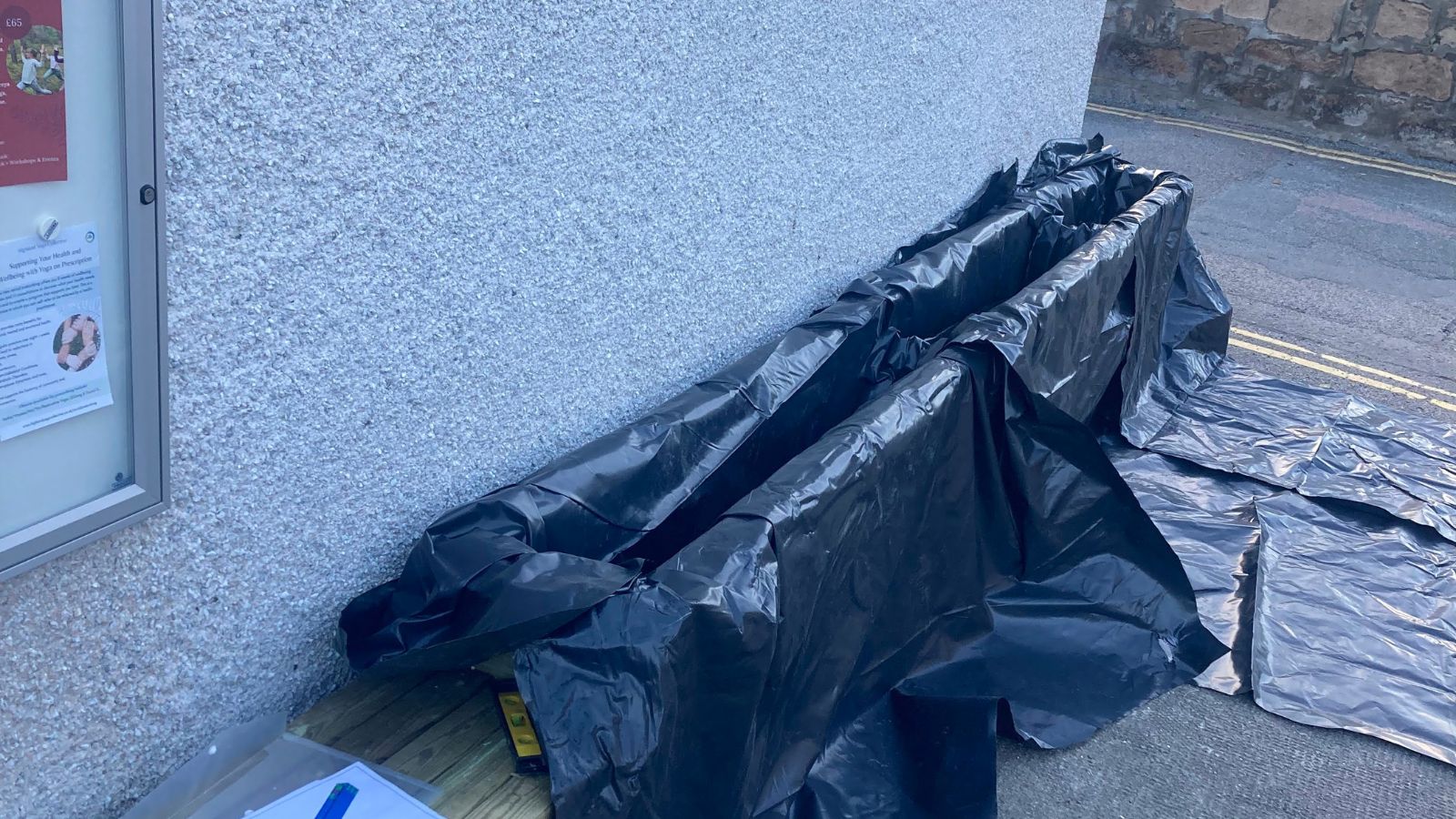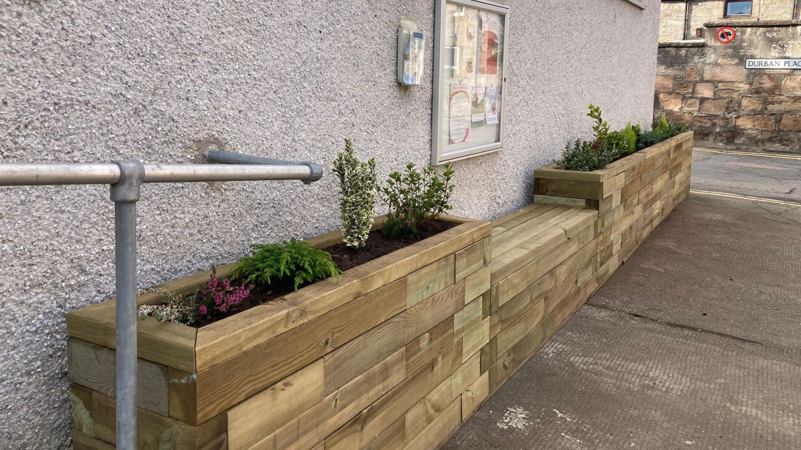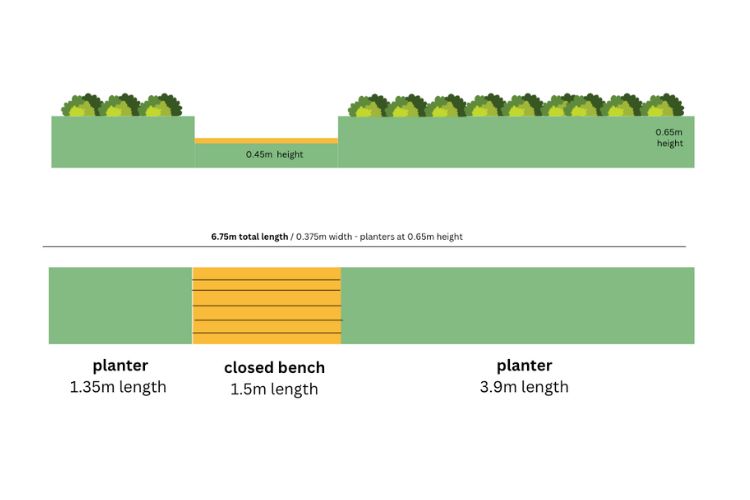 De bank moest 1,5 m breed zijn, gemeten vanaf het eerste deel van de plantenbak van 1,35 m, zodat het mededelingenbord niet verplaatst hoefde te worden. Door moderne afdekking te gebruiken, zou de constructie dicht bij het gebouw kunnen worden gebouwd en niet richting het looppad uitsteken in tegenstelling tot onze traditionele afdekking die aan elke kant 12,5 mm uitsteekt.