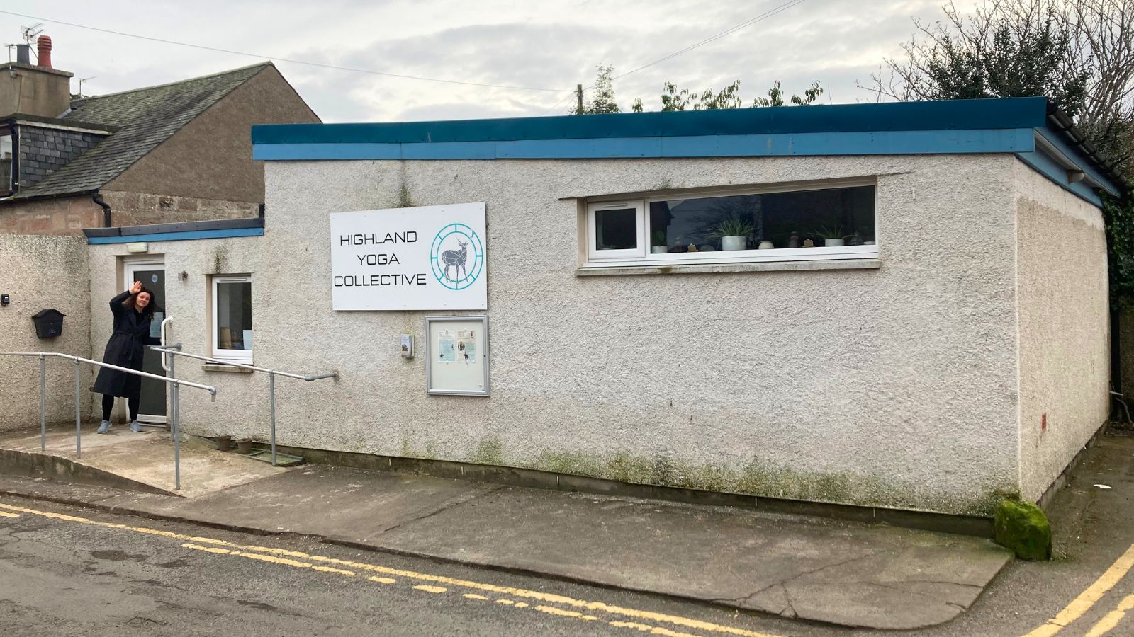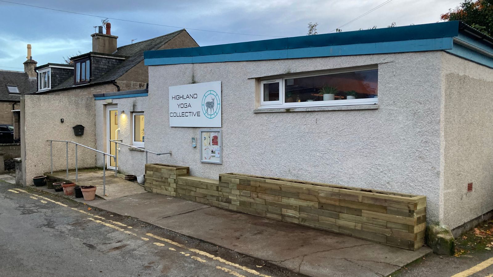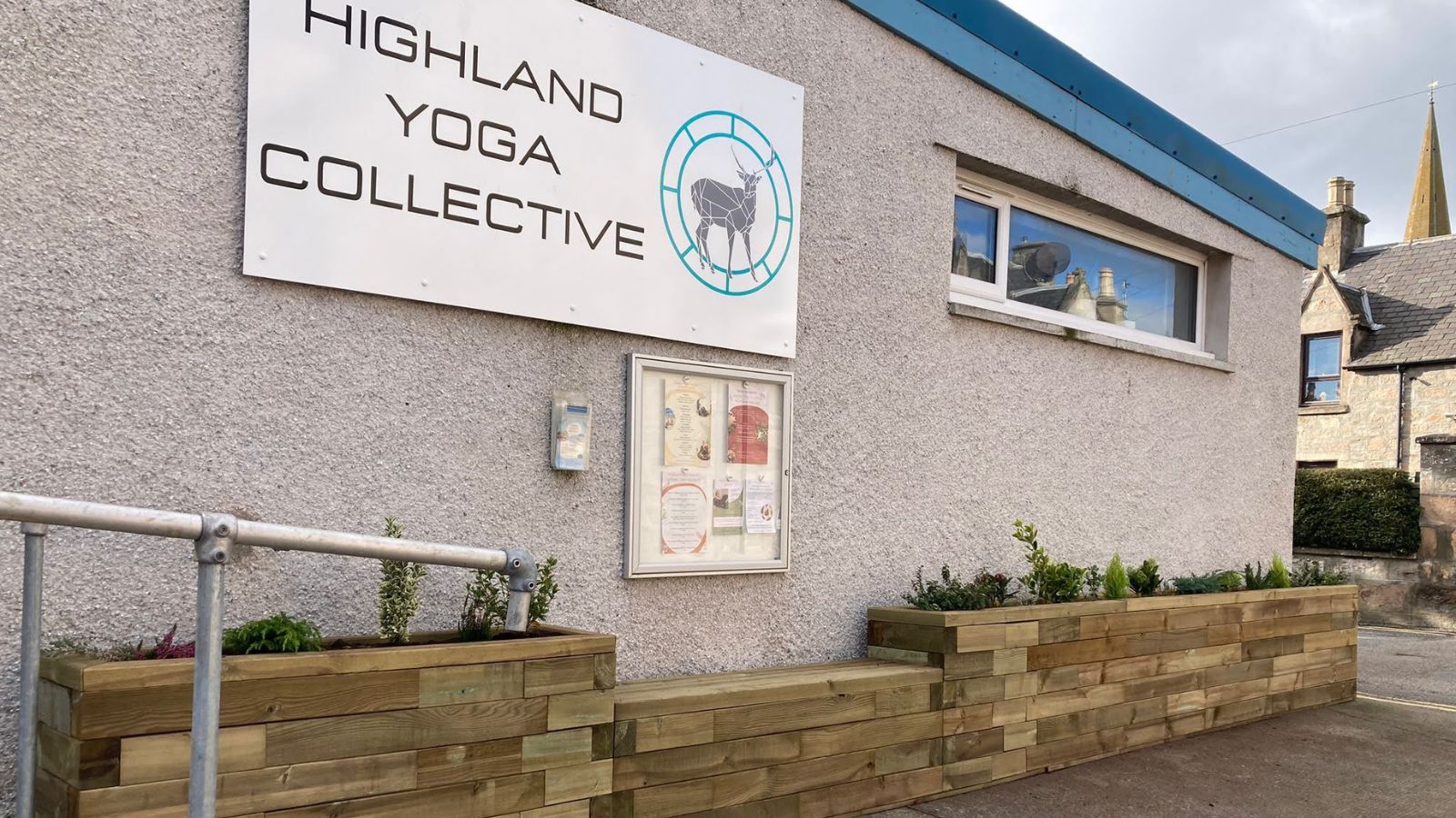 De studio van Highland Yoga Collective had behoefte aan meer groen aan de voorkant van het gebouw om de aanblik van het pad en het buitenpleister iets te verzachten. Er was voldoende ruimte voor een onderhoudsarme verhoogde plantenbak met een bankje, maar bij het ontwerp moest rekening gehouden worden met een vaste leuning en mededelingenbord dat al aan het gebouw was bevestigd.