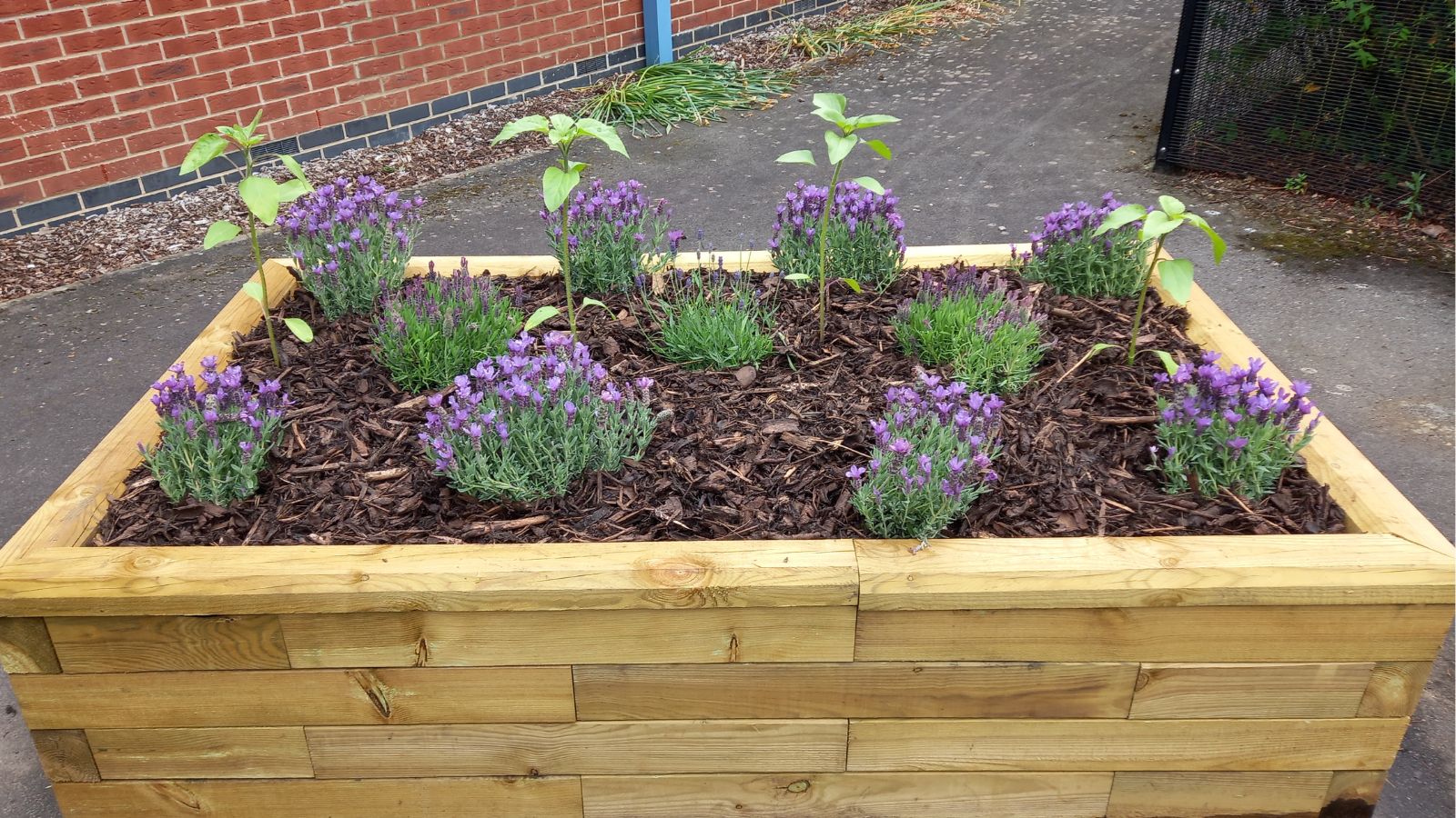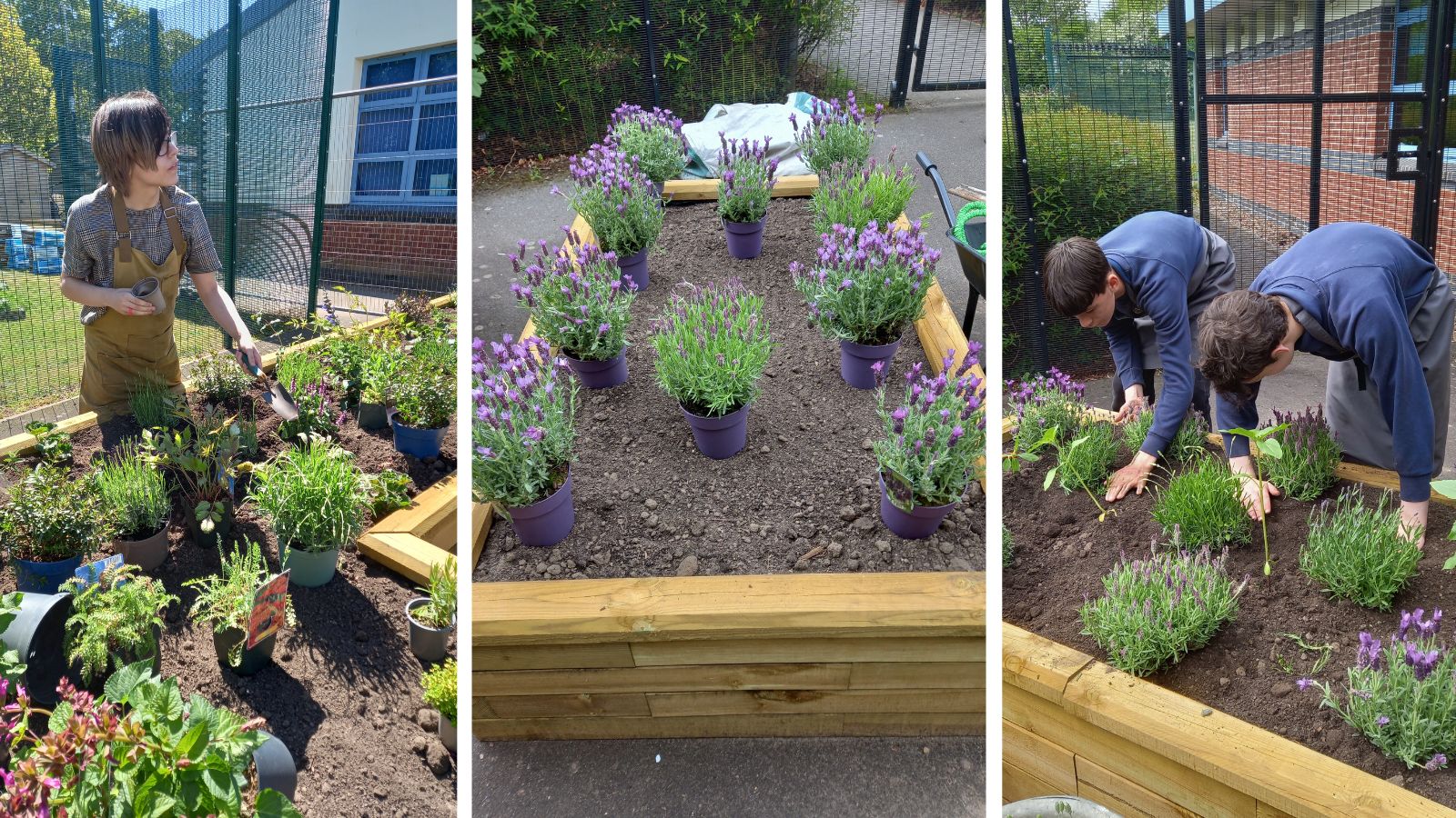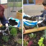 Ten slotte werden de verhoogde bakken met aarde gevuld. De leerlingen plantten daarna verschillende bloemen en struiken voordat ze ter afwerking een laag boomschors toevoegden.