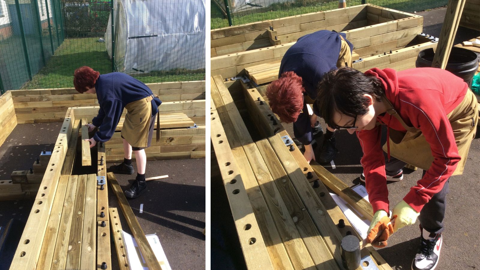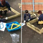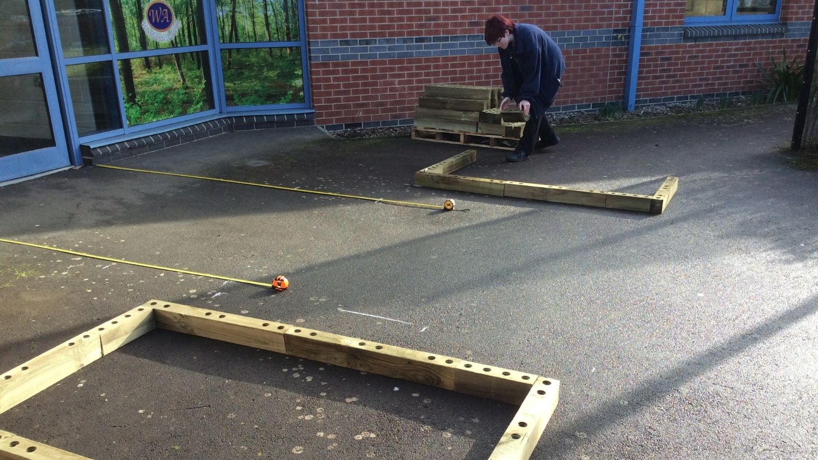 Omdat de plantenbakken op een geasfalteerd schoolpein werden gebouwd, was er minimaal voorbereidingswerk nodig. Er werd zorgvuldig gekeken welke delen van het plein het vlakst waren om het bouwen met WoodBlocX te beginnen. De kinderen waren bij alle aspecten van het project betrokken; ze begonnen met het opmeten van de ruimtes om ervoor te zorgen dat de verhoogde bakken op de juiste plaats zouden worden gebouwd. Bij het bouwen op een harde ondergrond kun je ervoor kiezen om hoekbeugels aan je bestelling toe te voegen om de WoodBlocX-structuur aan de grond te verankeren.