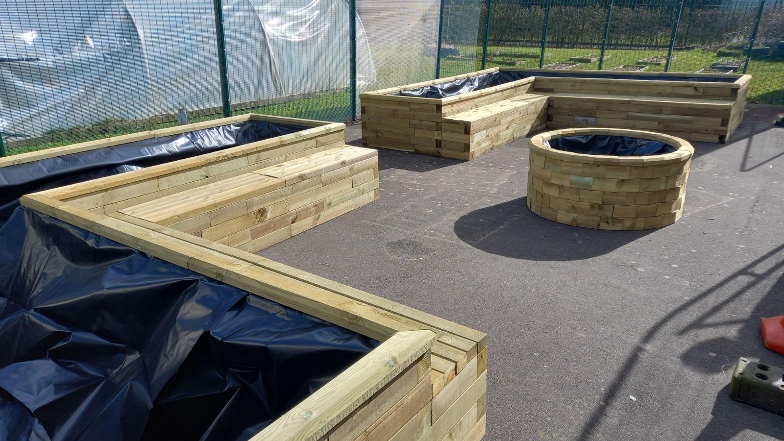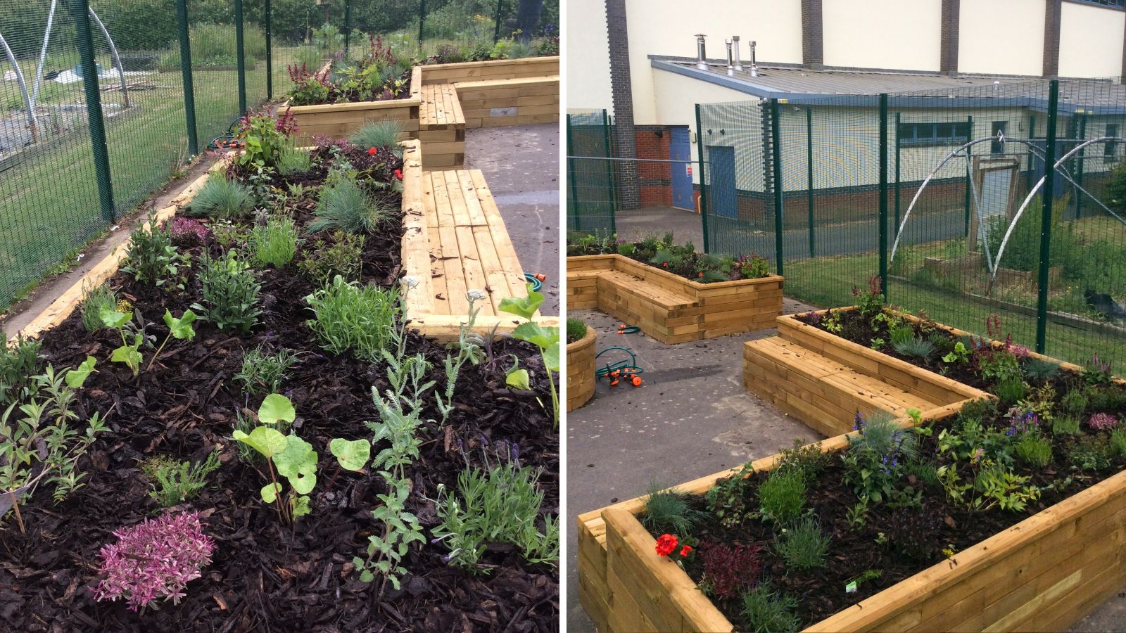 Om de ruimte optimaal te benutten koos de school voor een combinatie van op maat gemaakte L-vormige plantenbanken, rechthoekige bakken en ronde verhoogde bakken ontworpen door onze gratis ontwerpservice. De plantenbank werd gekozen om zitruimte voor de leerlingen te maken. Dankzij het grote aantal verhoogde bakken hebben de schoolkinderen voldoende ruimte om te planten en te leren over kweken en plantengroei, een belangrijk doel van het project.