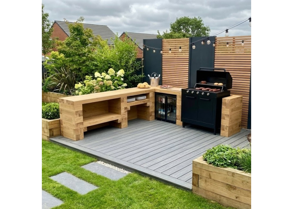 Met deze houten buitenkeuken neem je het koken mee naar buiten en kun je je gezin en vrienden gezellig in de buitenlucht vermaken. De buitenkeuken met werkblad en ruimte voor een barbecue, koelkast en ingebouwde planken, is in slechts enkele uren snel en eenvoudig te bouwen!
