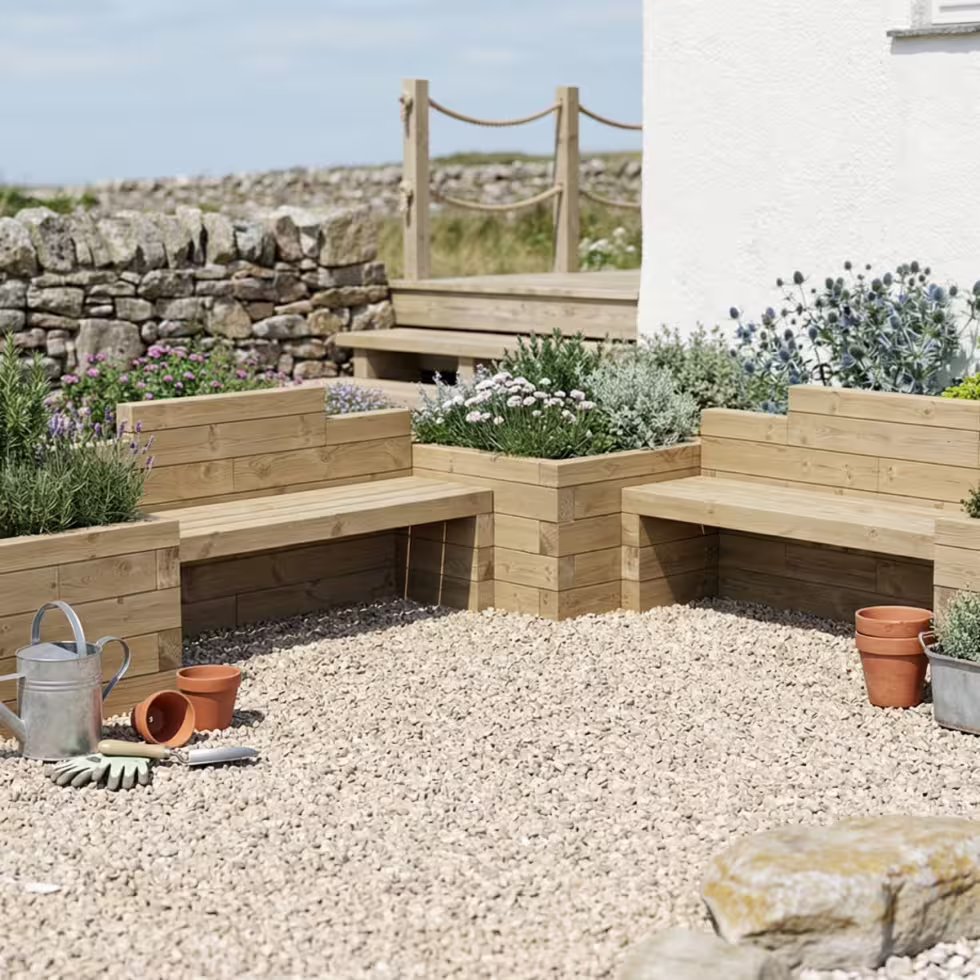 Deze kindertuinbank is voorzien van mooi afgewerkte moestuinbakken wat het geheel tot een mooie zithoek omtovert. Geef de kleine mensjes in je leven hun eigen zithoek in de tuin om heerlijk buiten te spelen en misschien zelfs hun eigen perkjes met kruiden, bloemen of vaste planten te laten groeien. Onze WoodBlocX zelfbouwpakketten zijn heel eenvoudig te bouwen. De houten zitplaatsen zijn iets lager dan gebruikelijk en dus ideaal voor jonge en kleine tuinders. De enige schroeven die je nodig hebt (het zijn er niet veel) worden mee geleverd - het kan niet eenvoudiger! Heb je liever enkele stoelen tussen de tuinbedden voor jouw kleine kweker? Ontwikkel zelf je op maat gemaakte tuinpakketten met onze gratis ontwerpservice. Zo creëer je de ideale zitplaats voor jong en oud in een handomdraai. Inspiratie nodig? Bekijk een reeks andere ontwerpen hier.