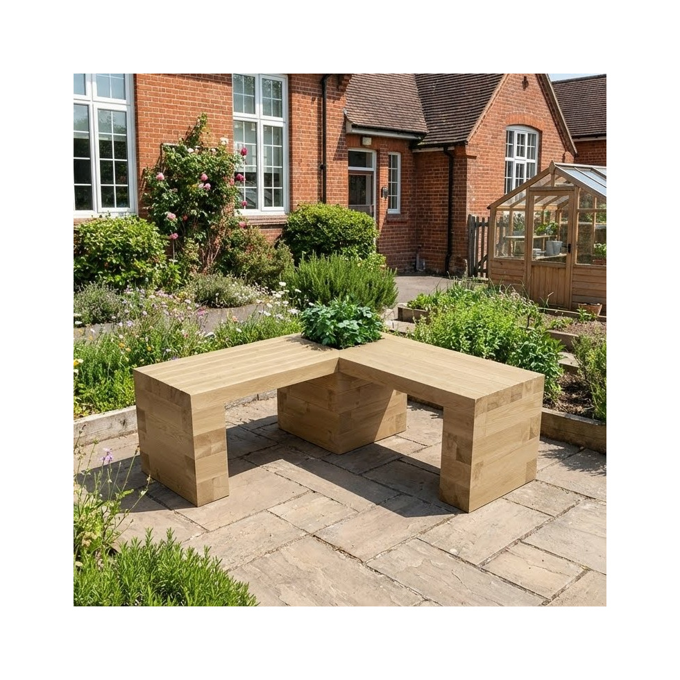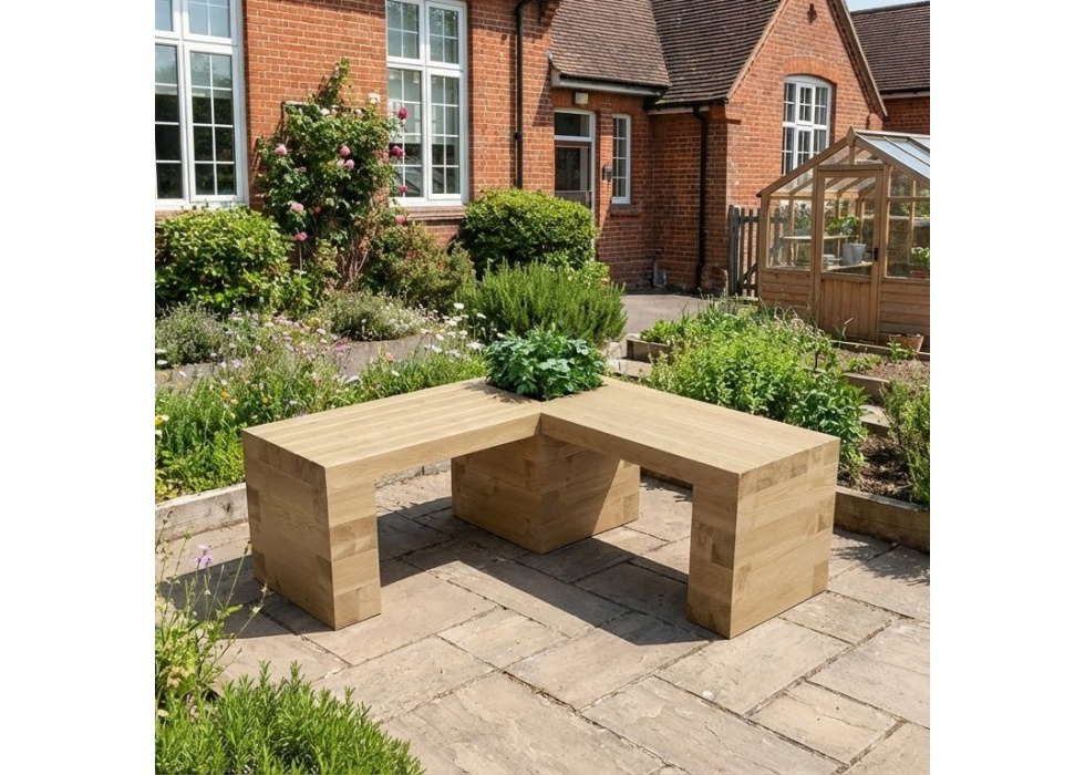 Hoogte van de zitbank: 0,45 m. Lengte van zitgedeelte: 0,75 m (L-vormig) Er is een kleine plantenbak in de hoek met binnenafmetingen van 0,3 m x 0,3 m x 0,45 m hoog. Gemaakt van duurzaam gewonnen hout dat is behandeld.