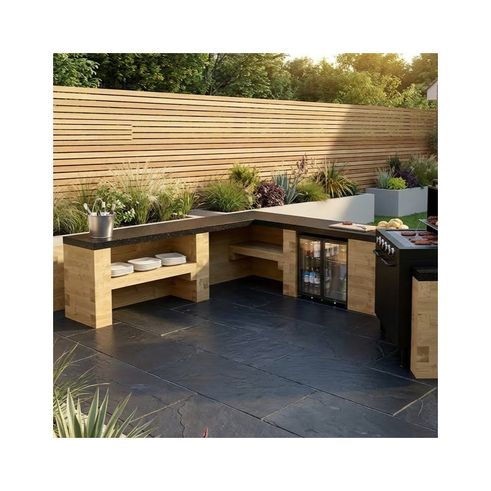 Dit keukenontwerp is ideaal voor terrassen of hoeken van de tuin en bevat planken en 3 houten krukken, zodat je vrienden en familie buiten kunnen relaxen terwijl ze toekijken hoe jij lekker aan het barbecueën bent in het kookgedeelte!