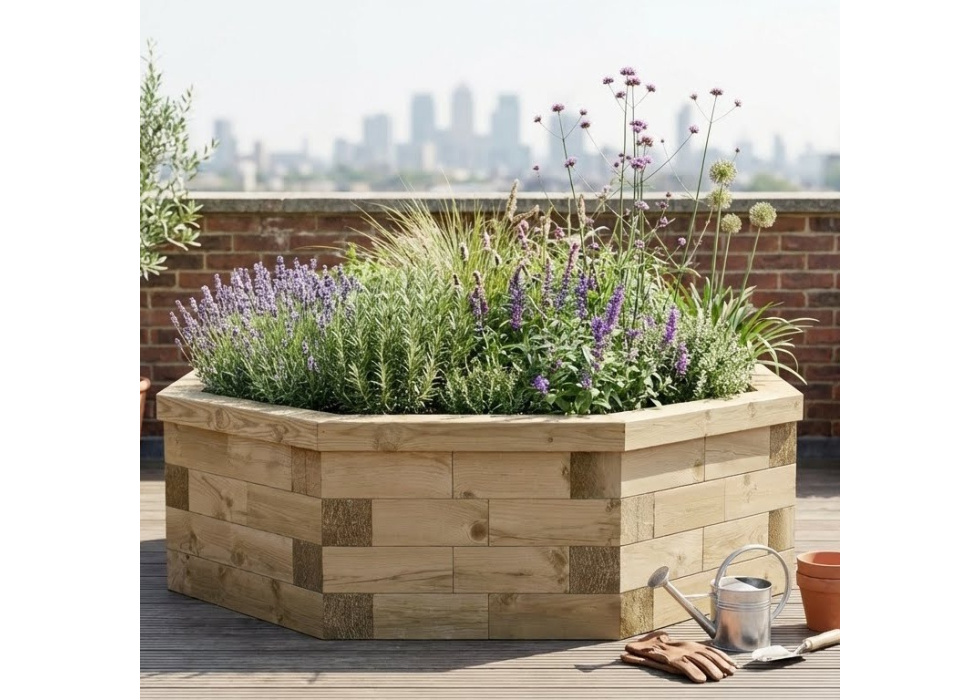Looks absolutely brilliant, everyone that's seen it says how great it looks. We had the olive tree in a pot which was getting a bit to small for the tree. The dilemma was that the tree was to heavy to lift out of the existing pot to replant into a bigger one. So the raised woodblox octagonal planter was just perfect to build around it. Absolutely love it !!! Arrived as stated ,well packed & fairly easy to put together. The hardest part was getting the ground level !!