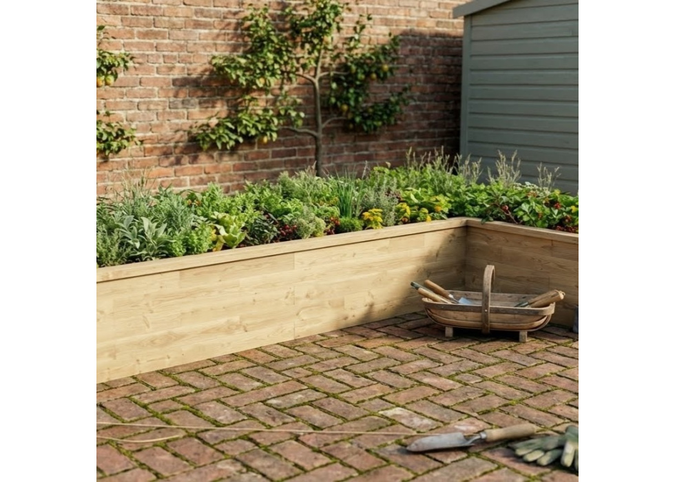 Deze L-vormige moestuinbak is groots in de waarste zin van het woord. Begrens je tuin met deze flinke moestuinbak of plaats hem in een hoek die de nodige verfraaiing wel kan gebruiken. Met onze veelzijdige zelfbouwpakketten voor de tuin kan je je fantasie de vrije loop laten.