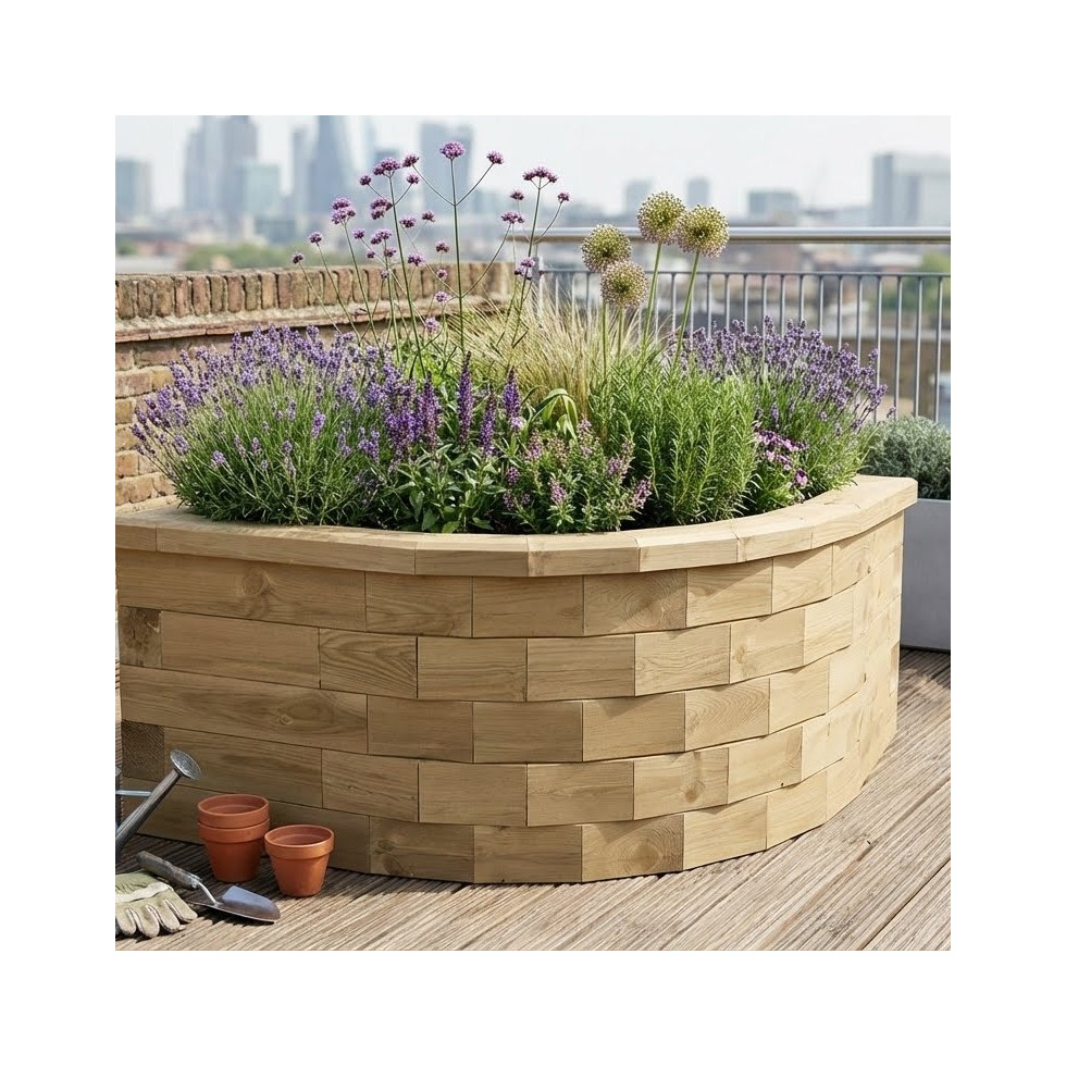 I bought a similar bed from them several years ago, and I still get lots of compliments on it. It has lasted incredibly well - we line it and cut some holes in the bottom, and it works on patio slabs very well. Extremely rare any water comes out the bottom. My partner (who is not into DIY!) built the last bed, and both of these new ones. It took three hours each on these quarter circles, plus lining. You do need to be strong! You're basically using the lump hammer on and off for the entire time, and of course occasionally something doesn't perfectly slot on so needs a few good whacks. But so long as you are strong they come together very well. You get a few extra bits of wood and also the pegs in case you go wrong. I would definitely buy the pipe cutter tool which we found easy to use. And a decent lump hammer!!