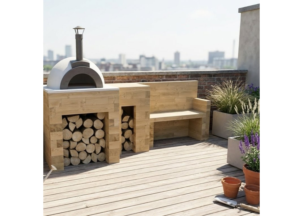 Bouw de ultieme pizzaoventafel in je tuin waar jij samen met anderen van kunnen genieten! Dit ontwerp biedt naast je pizzaoventafel een werkblad aan de zijkant voor alle bereidingen, opslagruimte voor stookhout eronder en ook nog een plekje om buiten te zitten... met deze WoodBlocX-kit kan het allemaal.