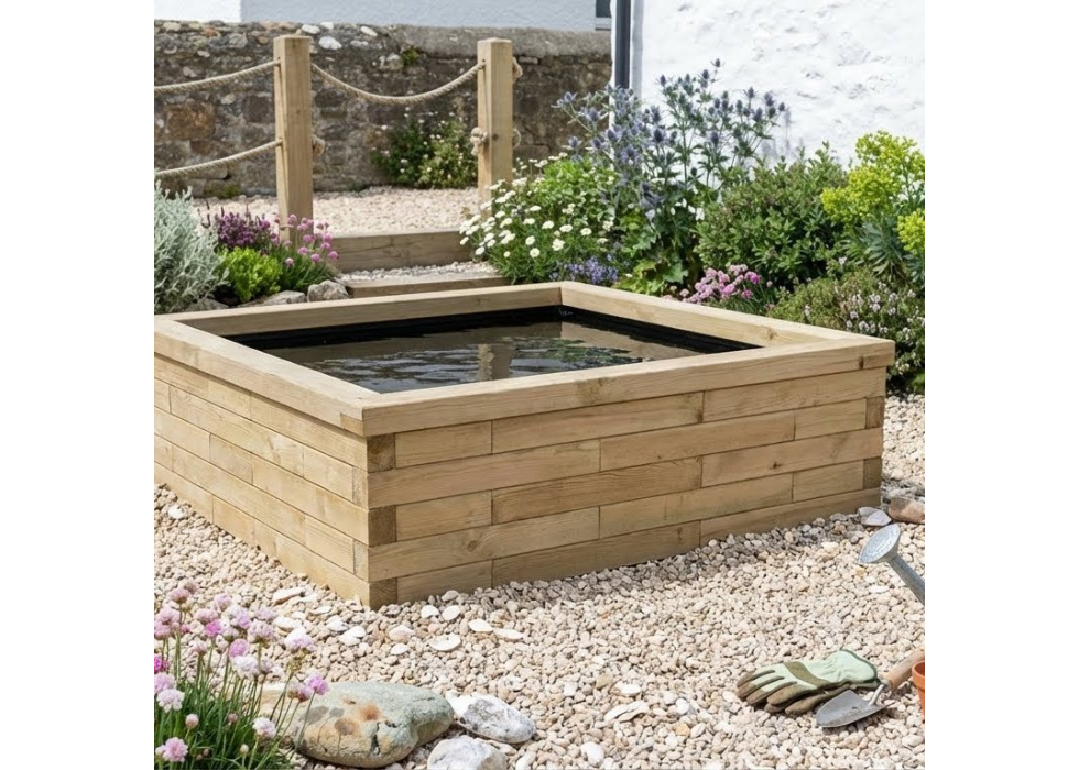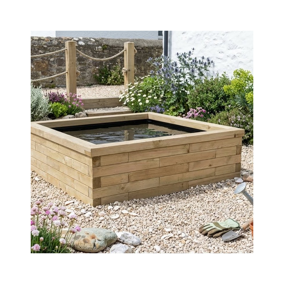 Met onze verhoogde houten vijverbakken kan je je tuin of binnenplaats dat extra sprankeltje vorm geven. Deze vijverbak is geschikt voor vissen en waterplanten. Als u op zoek bent naar een grotere vijver, raden we ons dubbelwandig ontwerp aan voor zowel meer ondersteuning en stabiliteit, alsook een extra omliggend kader dat je kan beplanten met een breed scala van planten, bloemen en andere gewassen.