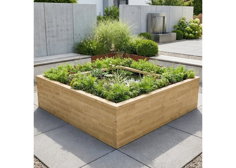 Deze vierkante houten vijverbak met dubbele wand van WoodBlocX is eenvoudig zelf te installeren!